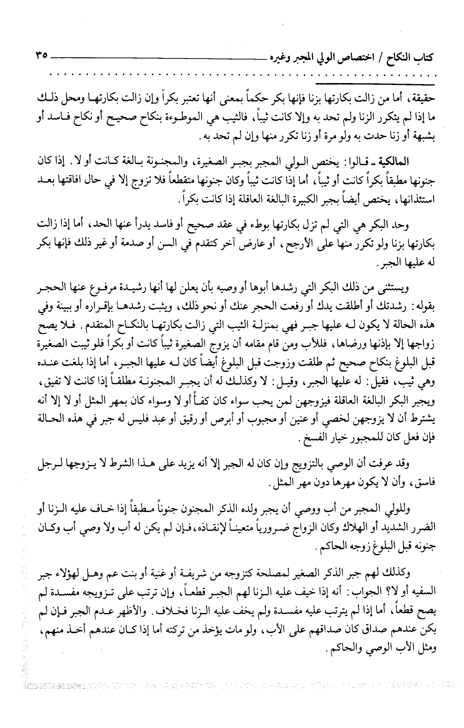 المالكية - قالوا: يختص الولي المجبر بجبر الصغيرة، والمجنونة بالغة كانت أو لا. إذا كان جنونها مطبقاً بكراً كانت أو ثيباً، أما إذا كانت ثيباً وكان جنونها متقطعاً فلا تزوج إلا في حال إفاقتها بعد استئذانها، يختص أيضاً بجبر الكبيرة البالغة العاقلة إذا كانت بكراً.