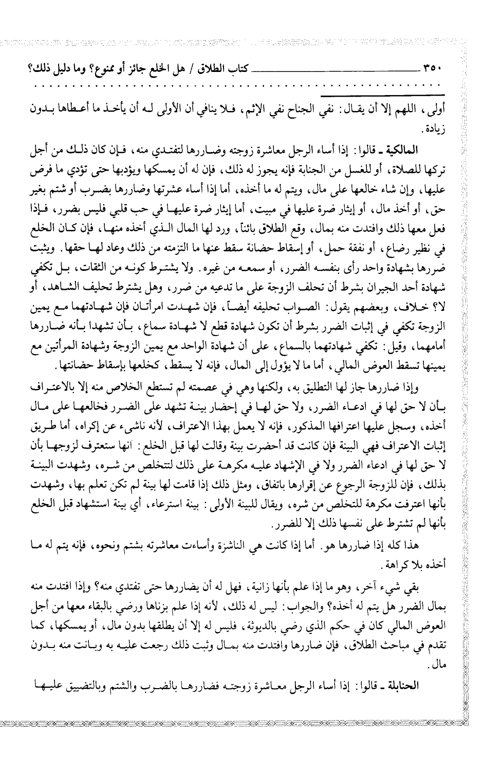 المالكية - قالوا: إذا أساء الرجل معاشرة زوجته وضاررها لتفتدي منه، فإن كان ذلك من أجل تركها للصلاة، أو للغسل من الجنابة فإنه يجوز له ذلك، فإن له أن يمسكها ويؤدبها حتى تؤدي ما فرض عليها، وإن شاء خالعها على مال، ويتم له ما أخذه، أما إذا أساء عشرتها وضاررها بضرب أو شتم بغير حق، أو أخذ مال، أو إيثار ضرة عليها في مبيت، أما إيثار ضرة عليها في حب قلبي فليس بضرر، فإذا فعل معها ذلك وافتدت منه بمال، وقع الطلاق بائناً، ورد لها المال الذي أخذه منها، فإن كان الخلع في نظير رضاع، أو نفقة حمل، أو إسقاط حضانة سقط عنها ما التزمته من ذلك وعاد لها حقها. ويثبت ضررها بشهادة واحد رأى بنفسه الضرر، أو سمعه من غيره. ولا يشترط كونه من الثقات، بل تكفي شهادة أحد الجيران بشرط أن تحلف الزوجة على ما تدعيه من ضرر، وهل يشترط تحليف الشاهد، أو لا؟ خلاف وبعضهم يقول: الصواب تحليفه أيضاً، فإن شهدت امرأتان فإن شهادتهما مع يمين الزوجة تكفي في إثبات الضرر بشرط أن تكون شهادة قطع لا شهادة سماع، بأن تشهدا بأنه ضاررها أمامهما، وقيل: تكفي شهادتهما بالسماع، على أن شهادة الواحد مع يمين الزوجة وشهادة المرأتين مع يمينها تسقط العوض المالي، أما ما لا يؤول إلى المال، فإنه لا يسقط، كخلعها بإسقاط حضانتها.