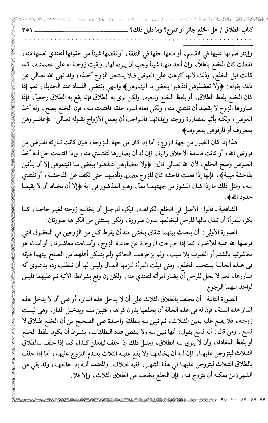 الصورة الثانية: أن يخلف بالطلاق الثلاث على أن لا يدخل هذه الدار، أو على أن لا يدخل هذه الدار هذه السنة، فإن له في هذه الحالة أن يخلعها بدون كراهة، فتبين منه ويدخل الدار، وهي ليست زوجته، فلا يقع عليه يمين الثلاث، ثم تبين منه بطلقة واحدة على الصحيح من أن الخلع طلاق لا فسخ. ومن قال: أنه فسخ يقول: أنها تبين منه ولا ينقص عدد الطلقات، بشرط أن يكون بلفظ الخلع أو بلفظ المفاداة، وأن لا ينوي به الطلاق، ومثل ذلك إذا حلف ليفعلن كذا، كما إذا حلف بالطلاق الثلاث ليتزوجن عليها، فإن له أن يخلعها ولا يقع عليه الثلاث بعدم التزوج عليها، أما إذا حلف بالطلاق الثلاث ليتزوجن عليها في هذا الشهر، ففيه خلاف. والمعتمد أنه إذا خالعها، وقد بقي من الشهر زمن يمكنه أن يتزوج فيه، فإن الخلع يخلصه من الطلاق الثلاث، وإلا فلا) .