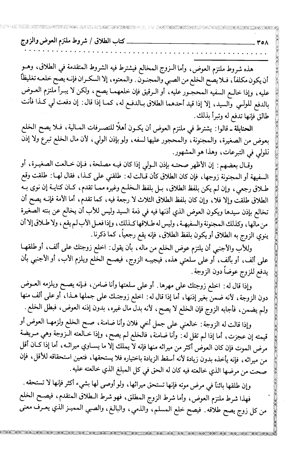 هذه شروط ملتزم العوض، وأما الزوج المخالع فيشترط فيه الشروط المتقدمة في الطلاق، وهو أن يكون مكلفاً، فلا يصح الخلع من الصبي والمجنون. والمعتوه، إلا السكران فإنه يصح خلعه تغليظاً عليه، وإذا خالع السفيه المحجور عليه، أو الرقيق فإن خلعهما يصح، ولكن لا يبرأ ملتزم العوض بالدفع للولي والسيد، إلا إذا قيد أحدهما الطلاق بالدفع له، كما إذا قال: إن دفعت لي كذا فأنت طالق فإنها تدفع له وتبرأ بذلك.