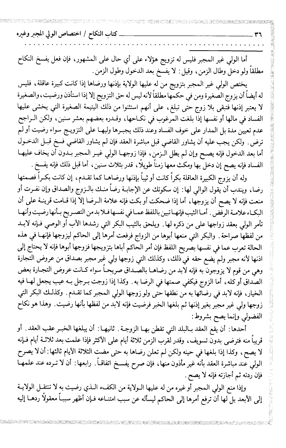 يختص الولي غير المجبر بتزويج من له عليها الولاية بإذنها ورضاها إذا كانت كبيرة عاقلة، فليس له أيضاً أن يزوج الصغيرة ومن في حكمها مطلقاً لأنه ليس له حق التزويج إلا إذا استأذن ورضيت، والصغيرة يعتبر إذنها فتبقى بلا زوج حتى تبلغ، على أنهم استثنوا من ذلك اليتيمة الصغيرة التي يخشى عليها الفساد في مالها أو نفسها إذا بلغت المرغوب في نكاحها، وقدره بعضهم بعشر سنين، ولكن الراجح عدم تعيين مدة بل المذار على خوف الفساد وعند ذلك يجبرها وليها على التزويج سواء رضيت أو لم ترض. ولكن يجب عليه أن يشاور القاضي قبل مباشرة العقد فإن لم يشاور القاضي فسخ قبل الدخول أما بعد الدخول فإنه يصح وإن لم يطل الزمن، فإذا زوجها الولي غير المجبر بدون أن يخاف عليها الفساد فإنه يصح إن دخل بها ومكث معها زمناً طويلاً، قدر بثلاث سنين، أما قبل ذلك فإنه يفسخ.