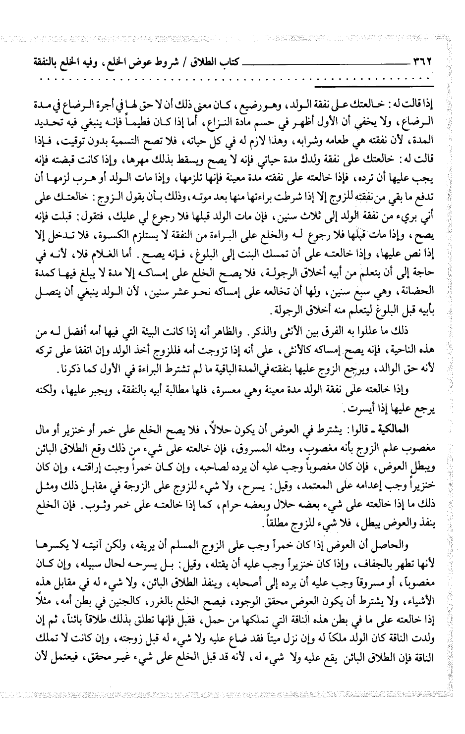 إذا قالت له: خالعتك عل نفقة الولد، وهو رضيع، كان معنى ذلك أن لا حق لها في أجرة الرضاع في مدة الرضاع، ولا يخفى أن الأول أظهر في حسم مادة النزاع، أما إذا كان فطيماً فإنه ينبغي فيه تحديد المدة، لأن نفقته هي طعامه وشرابه، وهذا لازم له في كل حياته، فلا تصح التسمية بدون توقيت، فإذا قالت له: خالعتك على نفقة ولدك مدة حياتي فإنه لا يصح ويسقط بذلك مهرها، وإذا كانت قبضته فإنه يجب عليها أن ترده، فإذا خالعته على نفقته مدة معينة فإنها تلزمها، وإذا مات الولد أو هرب لزمها أن تدفع ما بقي من نفقته للزوج إلا إذا شرطت براءتها منها بعد موته، وذلك بأن يقول الزوج: خالعتك على أني بريء من نفقة الولد إلى ثلاث سنين، فإن مات الولد قبلها فلا رجوع لي عليك، فتقول: قبلت فإنه يصح، وإذا مات قبلها فلا رجوع له والخلع على البراءة من النفقة لا يستلزم الكسوة، فلا تدخل إلا إذا نص عليها، وإذا خالعته على أن تمسك البنت إلى البلوغ، فإنه يصح. أما الغلام فلا، لأنه في حاجة إلى أن يتعلم من أبيه أخلاق الرجولة، فلا يصح الخلع على إمساكه إلا مدة لا يبلغ فيها كمدة الحضانة، وهي سبع سنين، ولها أن تخالعه على إمساكه نحو عشر سنين، لأن الولد ينبغي أن يتصل بأبيه قبل البلوغ ليتعلم منه أخلاق الرجولة.