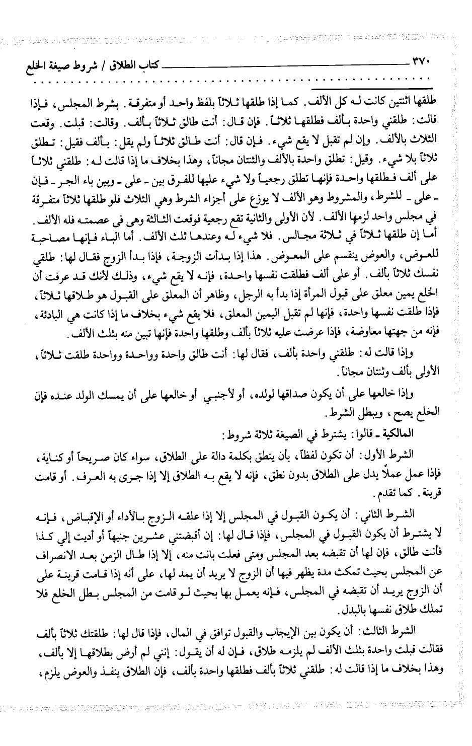 الشرط الثالث: أن يكون بين الإيجاب والقبول توافق في المال، فإذا قال لها: طلقتك ثلاثاً بألف فقالت قبلت واحدة بثلث الألف لم يلزمه طلاق، فإن له أن يقول: إنني لم أرض بطلاقها إلا بألف، وهذا بخلاف ما إذا قالت له: طلقني ثلاثاً بألف فطلقها واحدة بألف، فإن الطلاق ينفذ والعوض يلزم،