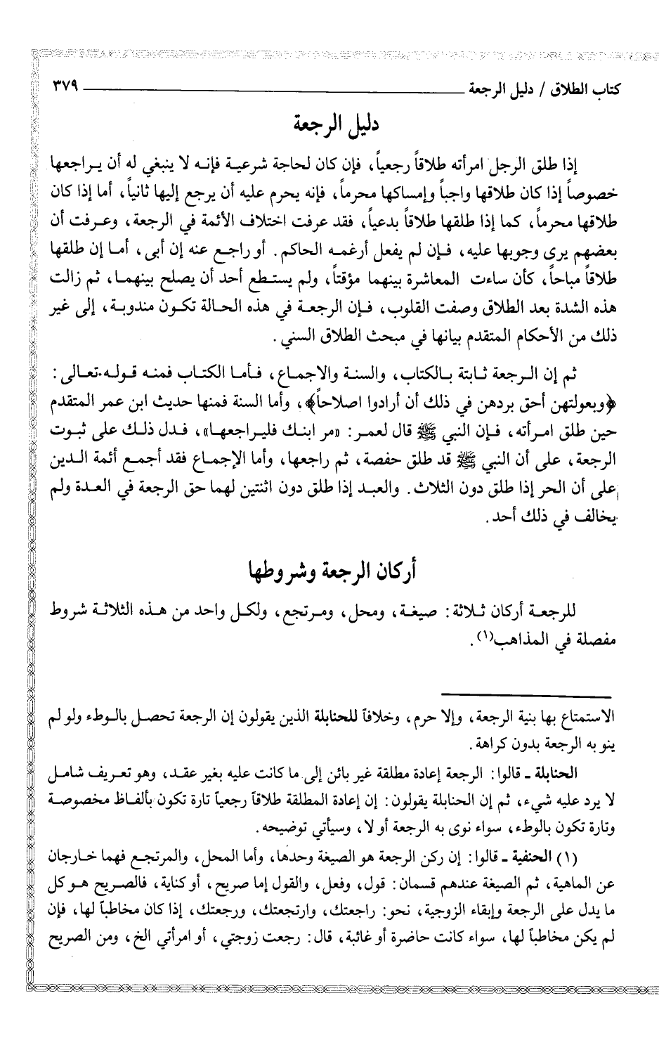 -إذا طلق الرجل امرأته طلاقاً رجعياً، فإن كان لحاجة شرعية فإنه لا ينبغي له أن يراجعها خصوصاً إذا كان طلاقها واجباً وإمساكها محرماً، فإنه يحرم عليه أن يرجع إليها ثانياً، أما إذا كان طلاقها محرماً، كما إذا طلقها طلاقاً بدعياً، فقد عرفت اختلاف الأئمة في الرجعة، وعرفت أن بعضهم يرى وجوبها عليه، فإن لم يفعل أرغمه الحاكم. أو راجع عنه إن أبى، أما إن طلقها طلاقاً مباحاً، كأن ساءت المعاشرة بينهما مؤقتاً، ولم يستطع أحد أن يصلح بينهما، ثم زالت هذه الشدة بعد الطلاق وصفت القلوب، فإن الرجعة في هذه الحالة تكون مندوبة، إلى غير ذلك من الأحكام المتقدم بيانها في مبحث الطلاق السني.