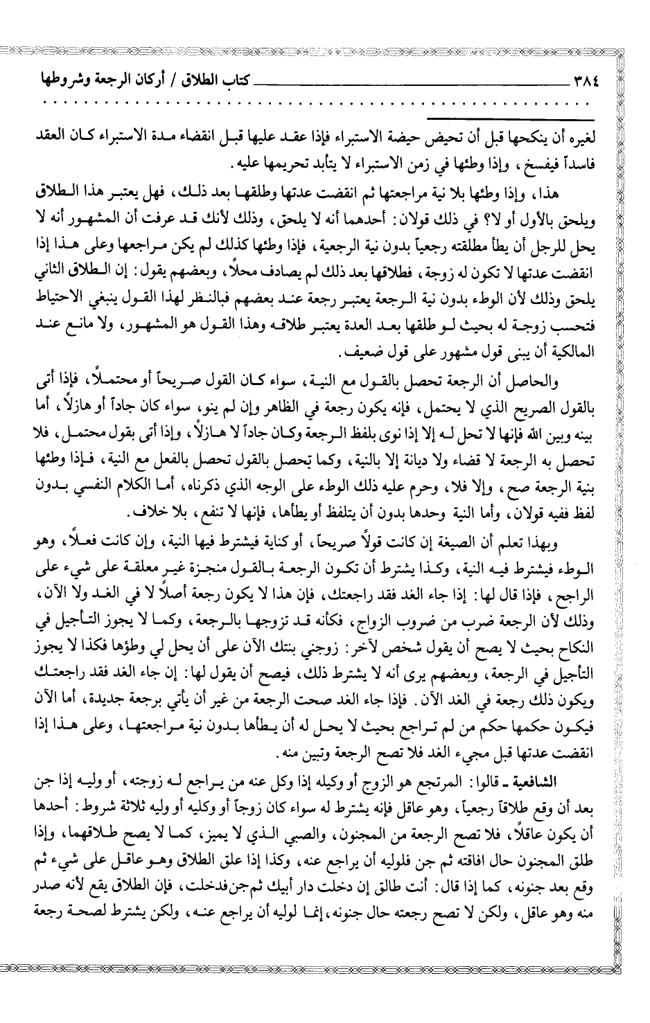 الشافعية - قالوا: المرتجع هو الزوج أو وكيله إذا وكل عنه من يراجع له زوجته، أو وليه إذا جن بعد أن وقع طلاقاً رجعياً، وهو عاقل فإنه يشترط له سواء كان زوجاً أو وكيله أو وليه ثلاثة شروط: أحدها أن يكون عاقلاً، فلا تصح الرجعة من المجنون، والصبي الذي لا يميز، كما لا يصح طلاقهما، وإذا طلق المجنون حال إفاقته ثم جن فلوليه أن يراجع عنه، وكذا إذا علق الطلاق وهو عاقل على شيء ثم وقع بعد جنونه، كما إذا قال: أنت طالق إن دخلت دار أبيك ثم جن فدخلت، فإن الطلاق يقع لأنه صدر منه وهو عاقل، ولكن لا تصح رجعته حال جنونه، إنما لوليه أن يراجع عنه، ولكن يشترط لصحة رجعة