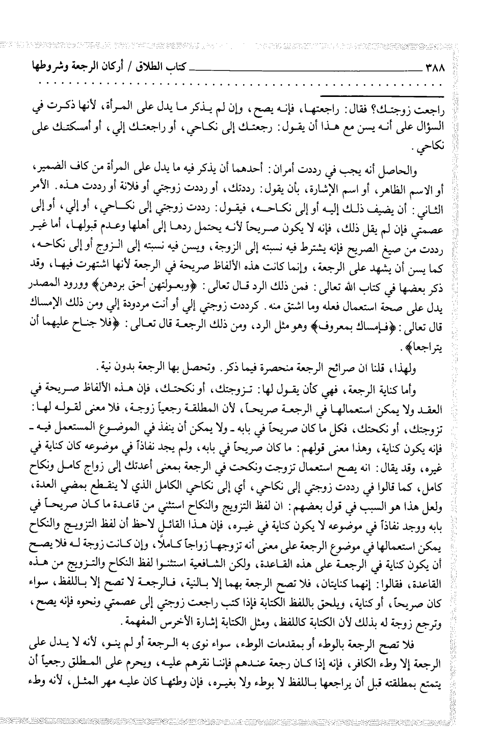والحاصل أنه يجب في رددت أمران: أحدهما أن يذكر فيه ما يدل على المرأة من كاف الضمير، أو الاسم الظاهر، أو اسم الإشارة، بأن يقول: رددتك، أو رددت زوجتي أو فلانة أو رددت هذه. الأمر الثاني: أن يضيف ذلك إليه أو إلى نكاحه، فيقول: رددت زوجتي إلى نكاحي، أو إلي، أو إلى عصمتي فإن لم يقل ذلك، فإنه لا يكون صريحاً لأنه يحتمل ردها إلى أهلها وعدم قبولها، أما غير رددت من صيغ الصريح فإنه يشترط فيه نسبته إلى الزوجة، ويسن فيه نسبته إلى الزوج أو إلى نكاحه، كما يسن أن يشهد على الرجعة، وإنما كانت هذه الألفاظ صريحة في الرجعة لأنها اشتهرت فيها، وقد ذكر بعضها في كتاب الله تعالى: فمن ذلك الرد قال تعالى: {وبعولتهن أحق بردهن} وورود المصدر يدل على صحة استعمال فعله وما اشتق منه. كرددت زوجتي إلي أو أنت مردودة إلي ومن ذلك الإمساك قال تعالى: {فإمساك بمعروف} وهو مثل الرد، ومن ذلك الرجعة قال تعالى {فلا جناح عليهما أن يتراجعا} .