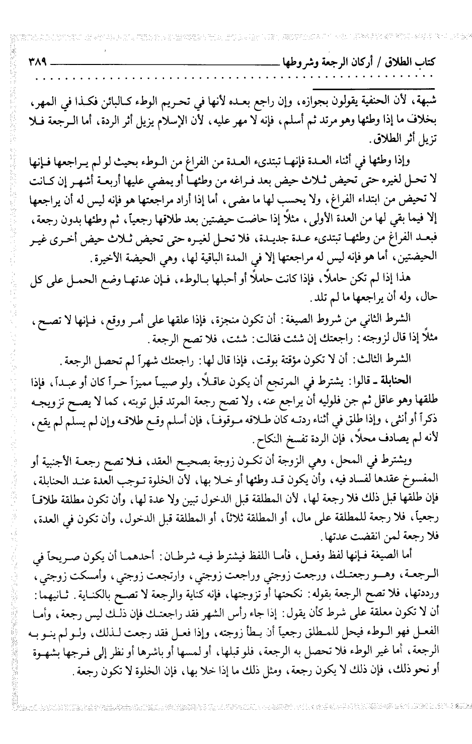 الحنابلة - قالوا: يشترط في المرتجع أن يكون عاقلاً، ولو صبياً مميزاً حراً كان أو عبداً، فإذا طلقها وهو عاقل ثم جن فلوليه أن يراجع عنه، ولا تصح رجعة المرتد قبل توبته، كما لا يصح تزويجه ذكراً أو أنثى، وإذا طلق في أثناء ردته كان طلاقه موقوفاً، فإن أسلم وقع طلاقه وإن لم يسلم لم يقع، لأنه لم يصادف محلاً، فإن الردة تفسخ النكاح.