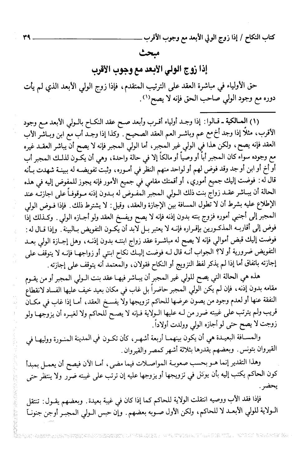(¬1) (المالكية - قالوا: إذا وجد أولياء أقرب وأبعد صح عقد النكاح بالولي الأبعد مع وجود الأقرب، مثلاً إذا وجد أخ مع عم وباشر العم العقد الصحيح. وكذا إذا وجد أب مع ابن وباشر الأب العقد فإنه يصح، ولكن هذا في الولي غير المجبر، أما الولي المجبر فإنه لا يصح أن يباشر العقد غيره مع وجوده سواء كان المجبر أباً أو وصياً أو مالكاً إلا في حالة واحدة، وهي أن يكون لذلك المجبر أب أو أخ أو ابن أو جد وقد فوض لهم أو لواحد منهم النظر في أموره، وثبت تفويضه له ببينة شهدت بأنه قال له: فوضت إليك جميع أموري، أو أقمتك مقامي في جميع الأمور فإنه يجوز للمفوض إليه في هذه الحالة أن يباشر عقد زواج بنت ذلك الولي المجبر المفوض له بدون إذنه موقوفاً على اجازته عند الإطلاع عليه بشرط أن لا تطول المسافة بين الإجازة والعقد، وقيل: لا يشترط ذلك. فإذا فوض الولي المجبر إلى أجنبي أموره فزوج بنته بدون إذنه فإنه لا يصح ويفسخ ولو أجازه الولي. وكذلك إذا فوض إلى أقاربه المذكورين بإقراره فإنه لا يعتبر بل لا بد أن يكون التفويض بالبينة. وإذا قال له: فوضت إليك قبض أموالي فإنه لا يصح له مباشرة عقد زواج ابنته بدون إذنه، وهل إجازة الولي بعد التفويض ضرورية أو لا؟ الجواب أنه قال له فوضت إليك نكاح ابنتي أو زواجها فإنه لا يتوقف على إجازته باتفاق أما إذا لم يذكر لفظ التزويج أو النكاح فقولان، والمعتمد أنه يتوقف على إجازته.