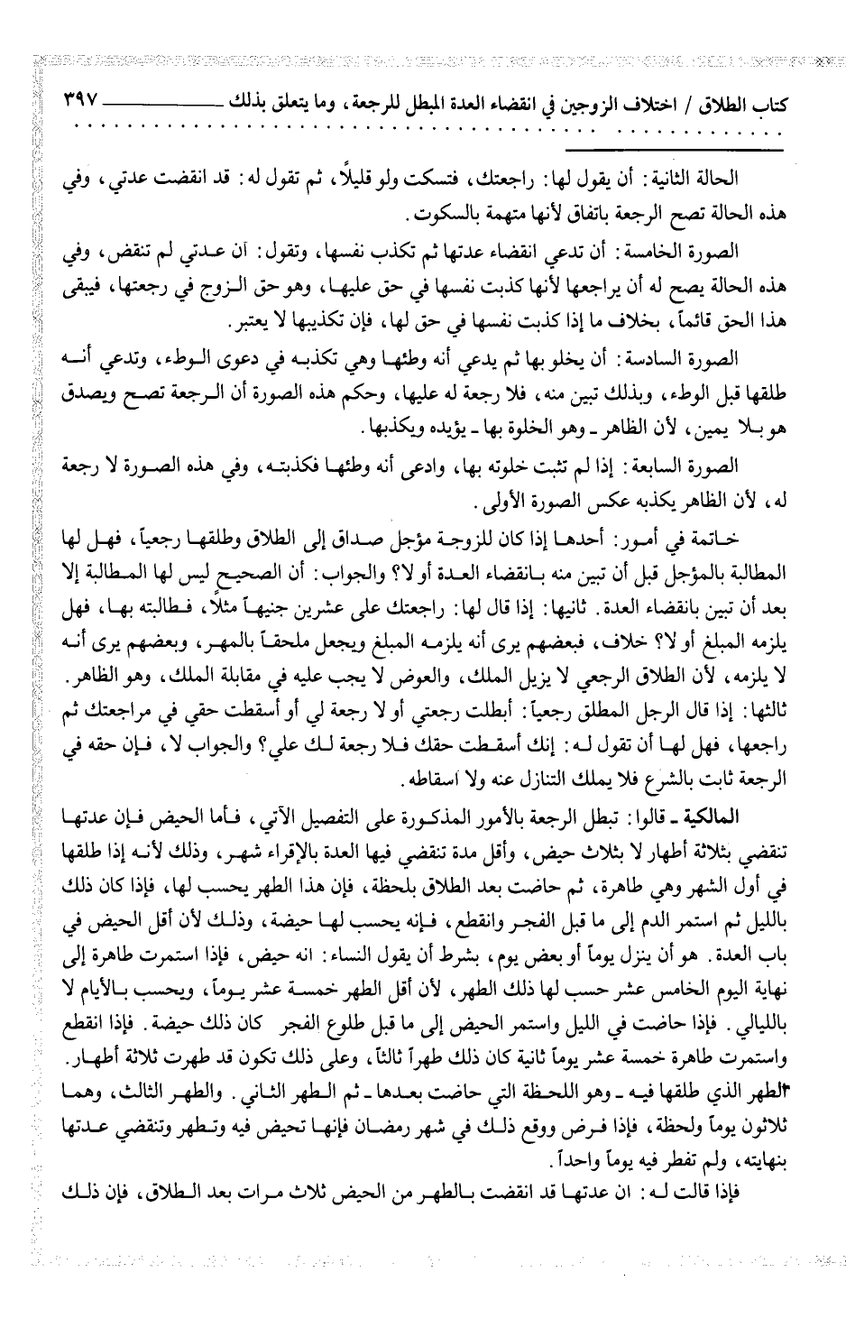 خاتمة في أمور: أحدها إذا كان للزوجة مؤجل صداق إلى الطلاق وطلقها رجعياً، فهل لها المطالبة بالمؤجل قبل أن تبين منه بانقضاء العدة أو لا؟ والجواب: أن الصحيح ليس لها المطالبة إلا بعد أن تبين بانقضاء العدة. ثانيها: إذا قال لها: راجعتك على عشرين جنيهاً مثلاً، فطالبته بها، فهل يلزمه المبلغ أو لا؟ خلاف، فبعضهم يرى أنه يلزمه المبلغ ويجعل ملحقاً بالمهر، وبعضهم يرى أنه لا يلزمه، لأن الطلاق الرجعي لا يزيل الملك، والعوض لا يجب عليه في مقابلة الملك، وهو الظاهر. ثالثها: إذا قال الرجل المطلق رجعياً: أبطلت رجعتي أو لا رجعة لي أو أسقطت حقي في مراجعتك ثم راجعها، فهل لها أن تقول له: إنك أسقطت حقك فلا رجعة لك علي؟ والجواب لا، فإن حقه في الرجعة ثابت بالشرع فلا يملك التنازل عنه ولا اسقاطه. المالكية - قالوا: تبطل الرجعة بالأمور المذكورة على التفصيل الآتي، فأما الحيض فإن عدتها تنقضي بثلاثة أطهار لا بثلاث حيض، وأقل مدة تنقضي فيها العدة بالإقراء شهر، وذلك لأنه إذا طلقها في أول الشهر وهي طاهرة، ثم حاضت بعد الطلاق بلحظة، فإن هذا الطهر يحسب لها، فإذا كان ذلك بالليل ثم استمر الدم إلى ما قبل الفجر وانقطع، فإنه يحسب لها حيضة، وذلك لأن أقل الحيض في باب العدة. هو أن ينزل يوماً أو بعض يوم، بشرط أن يقول النساء: إنه حيض، فإذا استمرت طاهرة إلى نهاية اليوم الخامس عشر حسب لها ذلك الطهر، لأن أقل الطهر خمسة عشر يوماً، ويحسب بالأيام لا بالليالي. فإذا حاضت في الليل واستمر الحيض إلى ما قبل طلوع الفجر كان ذلك حيضة. فإذا انقطع واستمرت طاهرة خمسة عشر يوماً ثانية كان ذلك طهراً ثالثاً، وعلى ذلك تكون قد طهرت ثلاثة أطهار. الطهر الذي طلقها فيه - وهو اللحظة التي حاضت بعدها - ثم الطهر الثاني.
