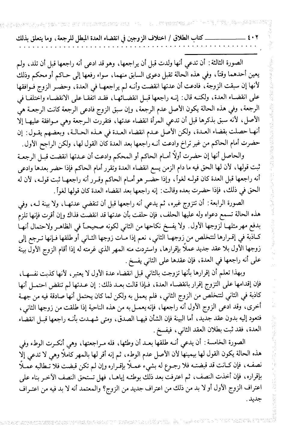 وبهذا تعلم أن إقرارها بأنها تزوجت بالثاني قبل انقضاء عدت الأول لا يعتبر، لأنها كذبت نفسها، فإن إقدامها على التزوج إقرار بانقضاء العدة، فإذا قالت بعد ذلك: إن عدتها لم تنقص احتمل أنها كاذبة في الثاني لتتخلص من زوج الثاني، فلم يعمل به ولكن لما كان يحتمل أنها صادقة فيه من جهة أخرى، وقد ادعى الزوج الأول أنه راجعها، فإنه يعمل به من هذه الناحية إذا طلقت من زوجها الثاني، فتعود إليه بدون عقد جديد، أما البينة فإن الشأن فيها الصدق، ومتى شهدت بأنه راجعها قبل انقضاء العدة، فقد ثبت بطلان العقد الثاني، فيفسخ. الصورة الخامسة: أن يدعي أنه طلقها بعد أن وطئها، فله مراجعتها، وهي أنكرت الوطء وفي هذه الحالة يكون القول لها بيمينها لأن الأصل عدم الوطء، ثم إنه أقر لها بالمهر كاملاً وهي لا تدعي إلا نصفه، فإن كانت قد قبضته فلا رجوع له بشيء عملاً بإقراره وإن لم تكن قبضت فلا تطالبه عملاً بإقراره، فإن أخذت النصف، ثم اعترفت بعد ذلك بوطئه إياها، فهل تستحق النصف الآخر بناء على اعتراف الزوج الأول أو لا بد من ذلك من اعتراف جديد من الزوج؟ والمعتمد أنه لا بد فيه من اعتراف جديد.