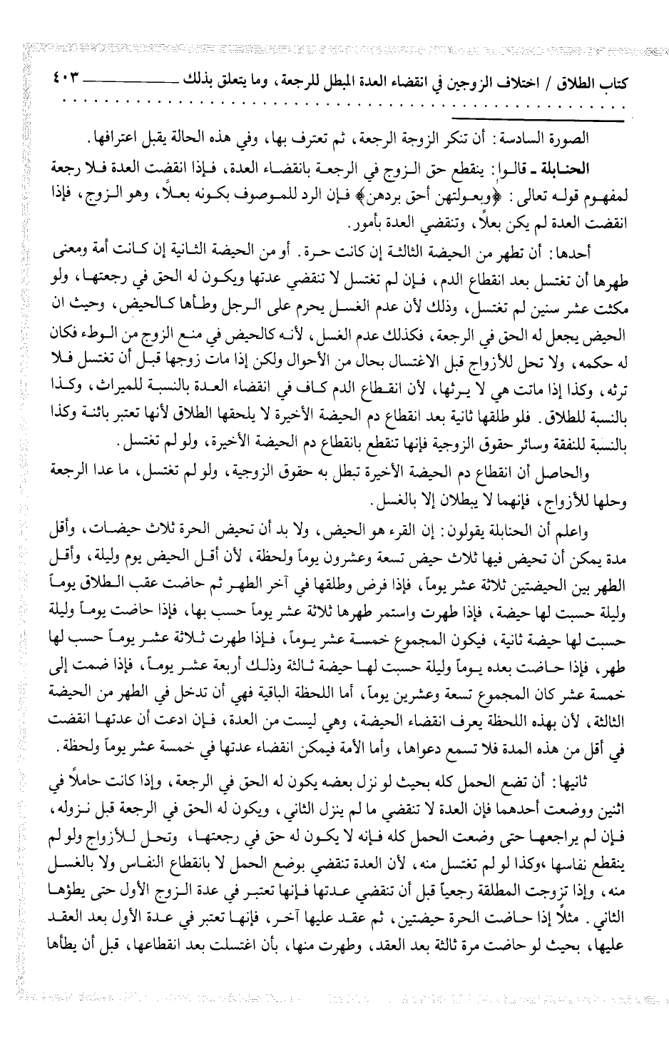 الحنابلة - قالوا: ينقطع حق الزوج في الرجعة بانقضاء العدة، فإذا انقضت العدة فلا رجعة لمفهوم قوله تعالى: {وبعولتهن أحق بردهن} فإن الرد للموصوف بكونه بعلاً، وهو الزوج، فإذا انقضت العدة لم يكن بعلاً، وتنقضي العدة بأمور.