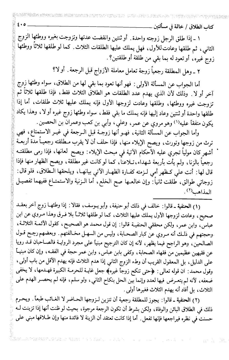 (¬1) (الحنفية - قالوا: خالف في ذلك أبو حنيفة، وأبو يوسف، فقالا: إذا وطئها زوج آخر بعقد صحيح، وعادت لزوجها الأول يملك عليها الثلاث، كما لو طلقها ثلاثاً بلا فرق وهذا مروي عن ابن عباس، وابن عمر، ولكن محققي الحنفية قالوا: إن قول محمد هو الصحيح، كقول الأئمة الثلاثة، وحجتهم في ذلك أنه مروي عن كبار الصحابة، وليس من السهل مخالفتهم. وبعضهم رجح قول الصالحين، وهو الراجح فيما يظهر، لأنه إن كان الترجيح مبنياً على مجرد الرواية فالصاحبان قد رويا عن فقيهين عظيمين من فقهاء الصحابة، وكفى بابن عباس، وابن عمر حجة في الفقه، وإن كان مبنياً على الدليل، بل المعقول القريب أن وطء الزوج الثاني إذا هدم الثلاث فإنه يهدم الأقل من باب أولى، وقول محمد: أن قوله تعالى: {حتى تنكح زوجاً غيره} جعل غاية للحرمة الكبيرة فهدمها، لا يخفى ضعفه، لأنه لم يتعرض فيها لعدد وإنما بين الحل بنكاح الثاني، ولو سلم، فإنه لم يحصر الهدم على الثلاث، بلا أفاد أنه يهدم الثلاث فغيرها أولى) .