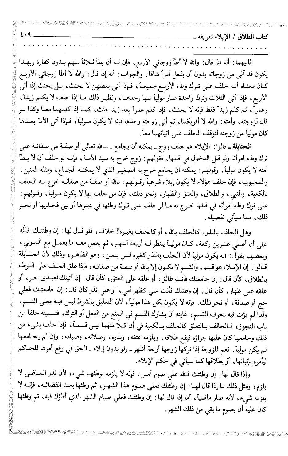 ثانيهما: أنه إذا قال: والله لا أطأ زوجاتي الأربع، فإن له أن يطأ ثلاثاً منهم بدون كفارة وبهذا يكون قد آلى من زوجاته بدون أن يفعل أمراً شاقاً. والجواب: أنه إذا قال: والله لا أطأ زوجاتي الأربع كان معناه أنه حلف على ترك وطء الأربع جميعاً، فإذا أتى بعضهن لا يحنث، بل يحنث إذا أتى الأربع، فإذا أتى الثلاث وترك واحدة صار مولياً منها وحدها، ونظير ذلك ما إذا حلف لا يكلم زيداً، وعمراً، ثم كلم زيداً فقط فإنه لا يحنث، فإذا كلم عمراً بعد زيد حنث، كما إذا كلمهما معاً وكذا لو قال لزوجته، وأمته: والله لا أقربكما، ثم أتى زوجته وحدها فإنه لا يكون مولياً، فإذا أتى الأمة بعدها كان مولياً من زوجته لتوقف الحلف على اتيانهما معاً.