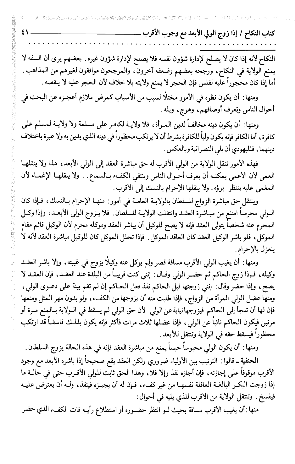 فهذه الأمور تنقل الولاية من الولي الأقرب له حق مباشرة العقد إلى الولي الأبعد، هذا ولا ينقلها العمى لأن الأعمى يمكنه أن يعرف أحوال الناس وينتقي الكفء بالسماع.. ولا ينقلها الإغماء لأن المغمى عليه ينتظر برؤه. ولا ينقلها الإحرام بالنسك إلى الأقرب.