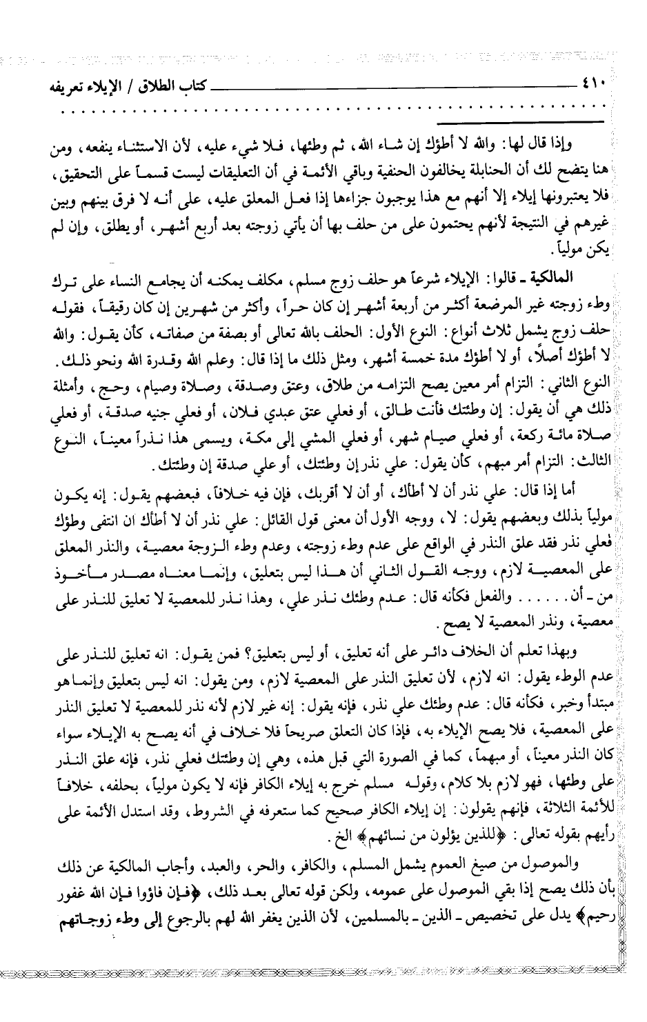 المالكية - قالوا: الإيلاء شرعاً هو حلف زوج مسلم، مكلف يمكنه أن يجامع النساء على ترك وطء زوجته غير المرضعة أكثر من أربعة أشهر إن كان حراً، وأكثر من شهرين إن كان رقيقاً، فقوله حلف زوج يشمل ثلاث أنواع: النوع الأول: الحلف بالله تعالى أو بصفة من صفاته، كأن يقول: والله لا أطؤك أصلاً، أو لا أطؤك مدة خمسة أشهر، ومثل ذلك ما إذا قال: وعلم الله وقدرة الله ونحو ذلك. النوع الثاني: التزام أمر معين يصح التزامه من طلاق، وعتق وصدقة، وصلاة وصيام، وحج، وأمثلة ذلك هي أن يقول: إن وطئتك فأنت طالق، فعلي عتق عبدي فلان، أو فعلي جنيه صدقة، أو فعلي صلاة مائة ركعة، أو فعلي صيام شهر، أو فعلي المشي إلى مكة، ويسمى هذا نذراً معيناً، النوع الثالث: التزام أمر مبهم، كأن يقول: علي نذر إن وطئتك، أو علي صدقة إن وطئتك.