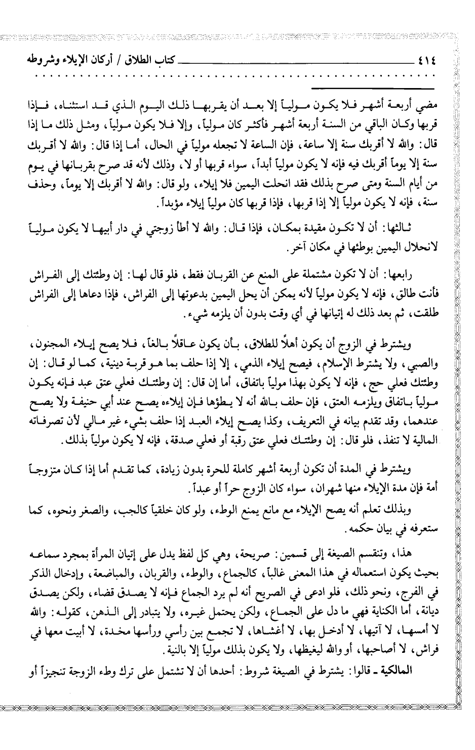 المالكية - قالوا: يشترط في الصيغة شروط: أحدها أن لا تشتمل على ترك وطء الزوجة تنجيزاً أو