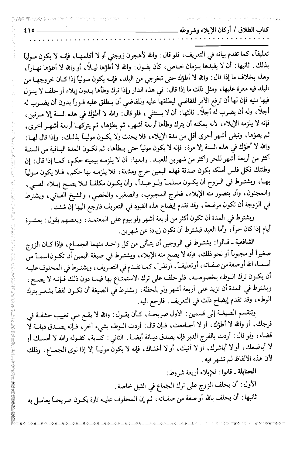 تعليقاً، كما تقدم بيانه في التعريف، فلو قال: والله لأهجرن زوجتي أو لا أكلمها، فإنه لا يكون مولياً بذلك. ثانيها: أن لا يقيدها بزمان خاص، كأن يقول: والله لا أطؤها ليلاً، أو والله لا أطؤها نهاراً، وهذا بخلاف ما إذا قال: والله لا أطؤك حتى تخرجي من البلد، فإنه يكون مولياً إذا كان خروجها من البلد فيه معرة عليها، ومثل ذلك ما إذا قال: في هذه الدار وإذا ترك وطأها بدون إيلاء أو حلف لا ينزل فيها منيه فإن لها أن ترفع الأمر للقاضي ليطلقها عليه وللقاضي أن يطلق عليه فوراً بدون أن يضرب له أجلاً، وله أن يضرب له أجلاً. ثالثها: أن لا يستثني، فلو قال: والله لا أطؤك في هذه السنة إلا مرتين، فإنه لا يلزمه الإيلاء، لأنه يمكنه أن يترك وطأها أربعة أشهر، ثم يطؤها، ثم يتركها أربعة أشهر أخرى، ثم يطؤها، وتبقى أشهر أخرى أقل من مدة الإيلاء، فلا يحنث ولا يكون مولياً بذلك، وإذا قال لها: والله لا أطؤك في هذه السنة إلا مرة، فإنه لا يكون مولياً حتى يطأها، ثم تكون المدة الباقية من السنة أكثر من أربعة أشهر للحر وأكثر من شهرين للعبد. رابعها: أن لا يلزمه بيمينه حكم، كما إذا قال: إن وطئتك فكل فلس أملكه يكون صدقة فهذه اليمين حرج ومشقة، فلا يلزمه بها حكم، فلا يكون مولياً بها، ويشترط في الزوج أن يكون مسلماً ولو عبداً، وأن يكون مكلفاً فلا يصح إيلاء الصبي، والمجنون، وأن يتصور منه الإيلاء، فخرج المجنون، والصغير، والخصي، والشيخ الفاني، ويشترط في الزوجة أن تكون مرضعة، وقد تقدم إيضاح هذه القيود في التعريف فارجع إليها إن شئت.