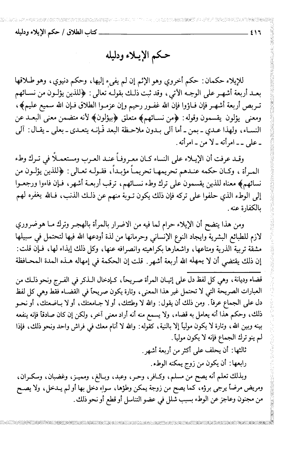 -للإيلاء حكمان: حكم أخروي وهو الإثم إن لم يفئ إليها، وحكم دنيوي، وهو طلاقها بعد أربعة أشهر على الوجه الآتي، وقد ثبت ذلك بقوله تعالى: {للذين يؤلون من نسائهم تربص أربعة أشهر فإن فاؤوا فإن الله غفور رحيم وإن عزموا الطلاق فإن الله سميع عليم} ، ومعنى يؤلون يقسمون وقوله: {من نسائهم} متعلق {بيؤلون} لأنه متضمن معنى البعد عن النساء، ولهذا عدي - بمن - أما آلى بدون ملاحظة البعد فإنه يتعدى - بعلى - يقال: آلى - على - امرأته - لا من - امرأته.