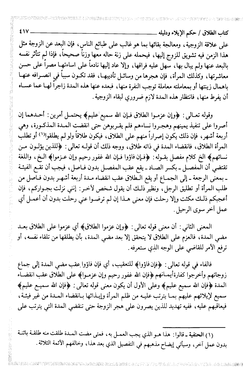 (¬1) (الحنفية - قالوا: هذا هو الذي يجب العمل به، فمتى مضت المدة طلقت منه طلقة بائنة بدون عمل آخر، وسيأتي إيضاح مذهبهم في التفصيل الذي بعد هذا، وخالفهم الأئمة الثلاثة) .