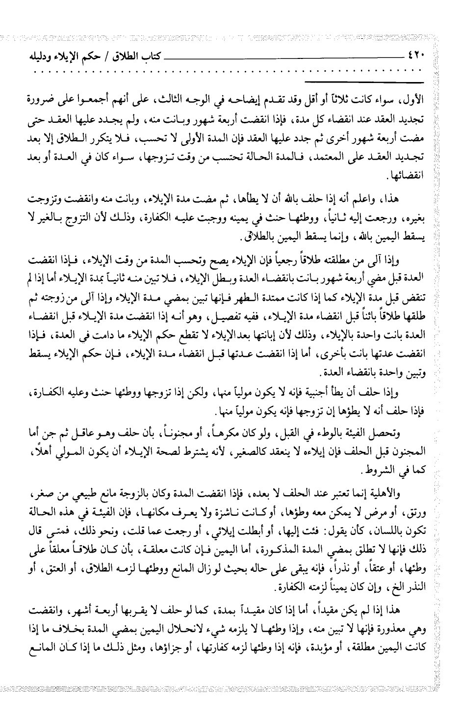 وإذا آلى من مطلقته طلاقاً رجعياً فإن الإيلاء يصح وتحسب المدة من وقت الإيلاء، فإذا انقضت العدة قبل مضي أربعة شهور بانت بانقضاء العدة وبطل الإيلاء، فلا تبين منه ثانياً بمدة الإيلاء أما إذا لم تنقض قبل مدة الإيلاء كما إذا كانت ممتدة الطهر فإنها تبين بمضي مدة الإيلاء وإذا آلى من زوجته ثم طلقها طلاقاً بائناً قبل انقضاء مدة الإيلاء، ففيه تفصيل، وهو أنه إذا انقضت مدة الإيلاء قبل انقضاء العدة بانت واحدة بالإيلاء، وذلك لأن إبانتها بعد الإيلاء لا تقطع حكم الإيلاء مادامت في العدة، فإذا انقضت عدتها بانت بأخرى، أما إذا انقضت عدتها قبل انقضاء مدة الإيلاء، فإن حكم الإيلاء يسقط وتبين واحدة بانقضاء العدة.