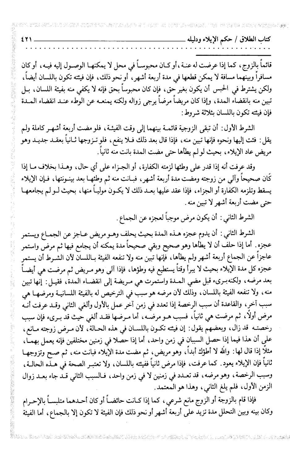 الشرط الثالث: أن يدوم عجزه هذه المدة بحيث يحلف وهو مريض عاجز عن الجماع ويستمر عجزه. أما إذا حلف أن لا يطأها وهو صحيح وبقي صحيحاً مدة يمكنه أن يجامع فيها ثم مرض واستمر عاجزاً عن الجماع أربعة أشهر ولم يطأها، فإنها تبين منه ولا تنفعه الفيئة باللسان لأن الشرط أن يستمر عجزه كل مدة الإيلاء بحيث لا يبرأ وقتاً يستطيع فيه وطؤها، فإذا آلى وهو مريض ثم مرضت هي أيضاً بعد مرضه، ولكنه برئ قبل مضي المدة واستمرت هي مريضة إلى انقضاء المدةـ فقيل: إنها تبين منه، ولا تنفعه الفيئة باللسان، وذلك لأن مرضه هو سبب في الترخيص له بالفيئة اللسانية ومرضها هي سبب آخر، والقاعدة أن سبب الرخصة إذا تعدد في زمن آخر عمل بالأول وألغي الثاني وقد عرفت أنه مرض أولاً، ثم مرضت هي ثانياً، فسبب هو مرضه، أما مرضها فقد ألغي حيث برئ فإن سبب رخصته قد زال، وبعضهم يقول: إن فيئته تكون باللسان في هذه الحالة، لأن مرض زوجته مانع، على أن هذا فيما إذا حصل السببان في زمن واحد، أما إذا حصلا في زمنين مختلفين فإنه يعمل بهما، مثلاً إذا قال لها: والله لا أطؤك أبداً، وهو مريض، ثم مضت مدة الإيلاء فبانت منه، ثم صح وتزوجها ثانياً فإن الإيلاء يعود. كما عرفت، فإذا مرض ثانياً ففيئته باللسان، ولا تعتبر الصحة في هذه الحالة، وسبب الرخصة، وهو مرضه، قد تعدد في زمنين لا في زمن واحد، فالسبب الثاني قد جاء بعد زوال الزمن الأول، فلم يلغ الثاني، وهذا هو المعتمد.