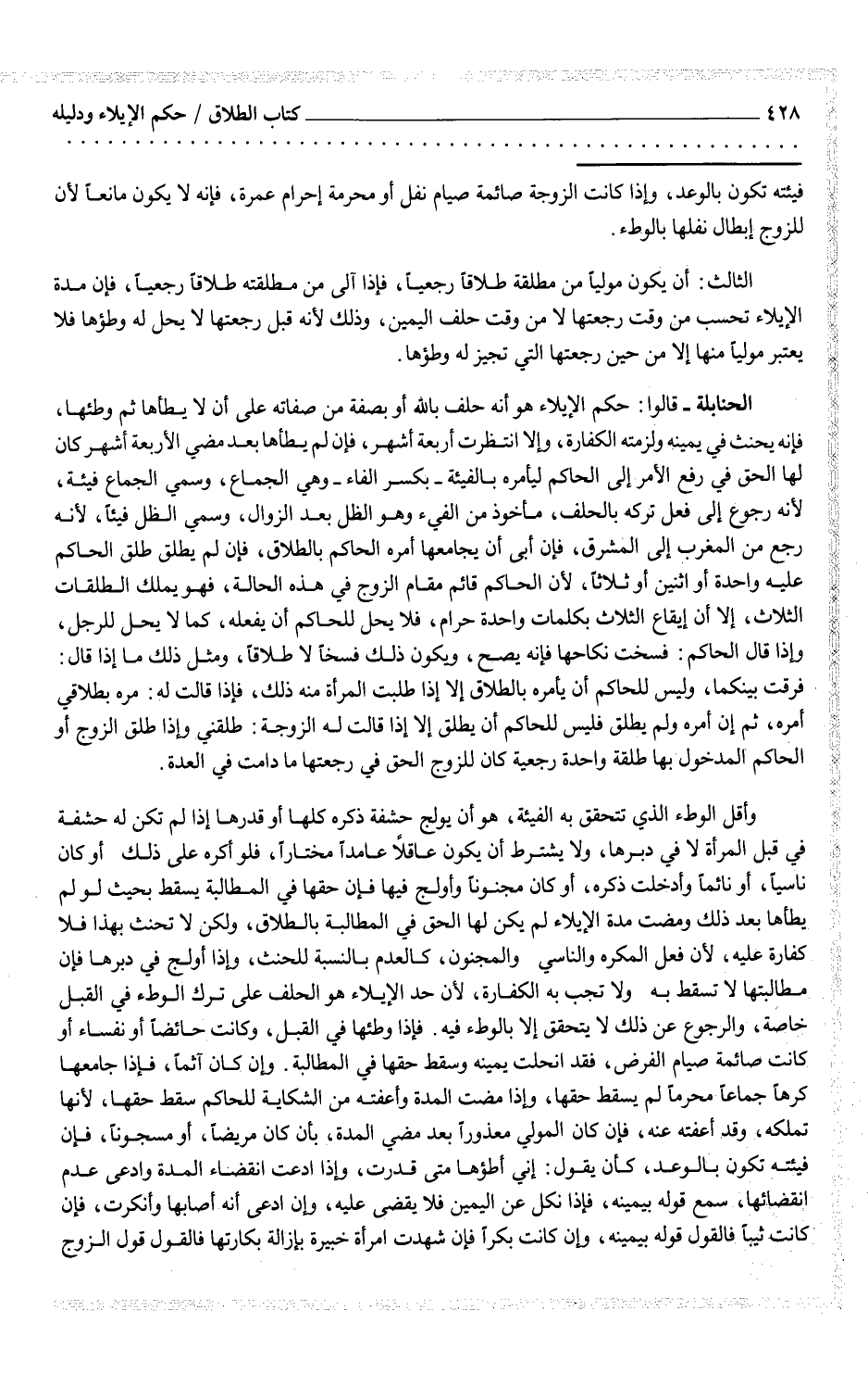 الحنابلة - قالوا: حكم الإيلاء هو أنه حلف بالله أو بصفة من صفاته على أن لا يطأها ثم وطئها، فإنه يحنث في يمينه ولزمته الكفارة، وإلا انتظرت أربعة أشهر، فإن لم يطأها بعد مضي الأربعة أشهر كان لها الحق في رفع الأمر إلى الحاكم ليأمره بالفيئة - بكسر الفاء - وهي الجماع، وسمي الجماع فيئة، لأنه رجوع إلى فعل تركه بالحلف، مأخوذ من الفيء وهو الظل بعد الزوال، وسمي الظل فيئاً، لأنه رجع من المغرب إلى المشرق، فإن أبى أن يجامعها أمره الحاكم بالطلاق، فإن لم يطلق طلق الحاكم عليه واحدة أو اثنين أو ثلاثاً، لأن الحاكم قائم مقام الزوج في هذه الحالة، فهو يملك الطلقات الثلاث، إلا أن إيقاع الثلاث بكلمات واحدة حرام، فلا يحل للحاكم أن يفعله، كما لا يحل للرجل، وإذا قال الحاكم: فسخت نكاحها فإنه يصح، ويكون ذلك فسخاً لا طلاقاً، ومثل ذلك ما إذا قال: فرقت بينكما، وليس للحاكم أن يأمره بالطلاق إلا إذا طلبت المرأة منه ذلك، فإذا قالت له: مره بطلاقي أمره، ثم إن أمره ولم يطلق فليس للحاكم أن يطلق إلا إذا قالت له الزوجة: طلقني وإذا طلق الزوج أو الحاكم المدخول بها طلقة واحدة رجعية كان للزوج الحق في رجعتها ما دامت في العدة.