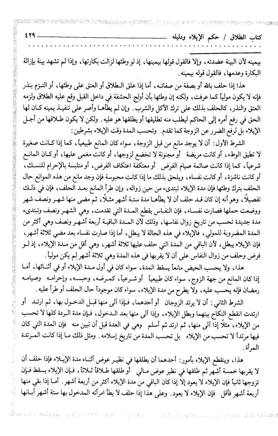 الشرط الأول: أن لا يوجد مانع من قبل الزوجة، سواء كان المانع طبيعياً، كما إذا كانت صغيرة لا تطيق الوطء، أو كانت مريضة أو مجنونة لا تخضع لزوجها، أو كانت مغمى عليها، أو كان المانع شرعياً، كما إذا كانت صائمة صيام الفرض أو معتكفة أعتكاف الفرض، أو متلبسة بالإحرام للنسك، أو كانت ناشة، أو كانت نفساء، ويلحق بذلك ما إذا كانت محبوسة فإن وجد مانع من هذه الموانع حال الحلف بترك وطئها فإن مدة الإيلاء تبتدئ من حين زواله، وإن طرأ المانع بعد الحلف، فإن في ذلك تفصيلاً، وهو أنه إن كان قد حلف أن لا يطأها مدة ستة أشهر مثلاً، ثم مضى منها شهر ونصف شهر ووضعت حملها فصارت نفساء، فإن النفاس يقطع المدة التي تقدمت، وهي الشهر ونصف وتبتدئ مدة جديدة تحسب من تاريخ زوال نفاسها وذلك لأن المدة الباقية أربعة أشهر ونصف وهي أكثر من المدة المضروبة للمولي، فالإيلاء في هذه الحالة لا يبطل، أما إذا صارت نفساء بعد مضي ثلاثة أشهر، فإن الإيلاء يبطل، لأن الباقي من المدة التي حلف عليها ثلاثة أشهر، وهي أقل من مدة الإيلاء، إذا لو فرض وحلف من زوال النفاس على أن لا يقربها في هذه المدة وهي ثلاثة أشهر لم يكن مولياً.
