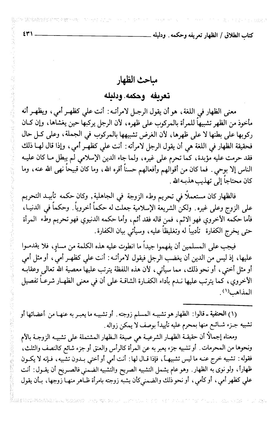 (¬1) (الحنفية - قالوا: الظهار هو تشبيه المسلم زوجته. أو تشبيه ما يعبر به عنها من أعضائها أو تشبيه جزء شائع منها بمحرم عليه تأبيداً بوصف لا يمكن زواله.