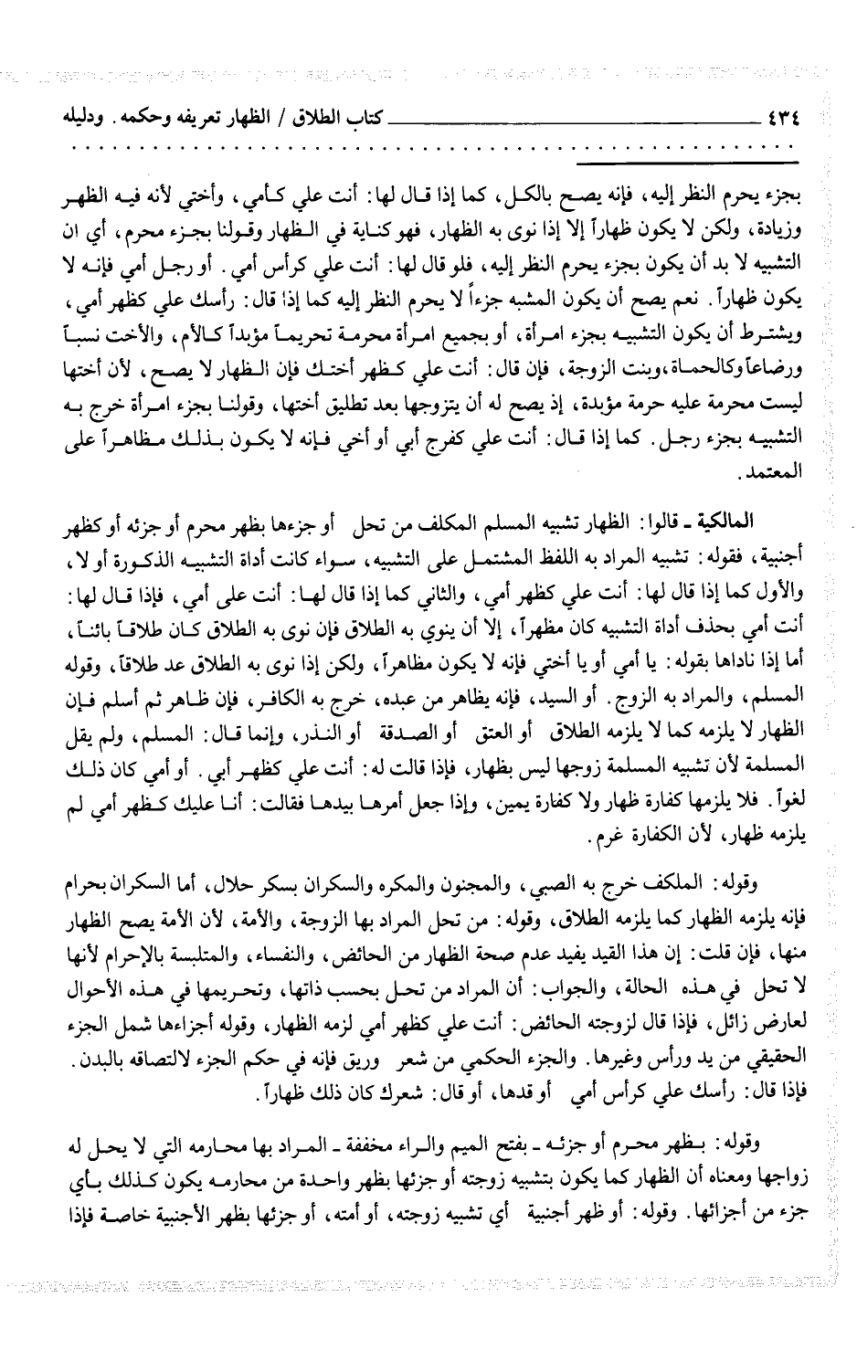 المالكية - قالوا: الظهار تشبيه المسلم المكلف من تحل أو جزءها بظهر محرم أو جزئه أو كظهر أجنبية، فقوله: تشبيه المراد به اللفظ المشتمل على التشبيه، سواء كانت أداة التشبيه الذكورة أو لا. والأول كما إذا قال لها: أنت علي كظهر أمي، والثاني كما إذا قال لها: أنت على أمي، فإذا قال لها: أنت أمي بحذف أداة التشبيه كان مظهراً، إلا أن ينوي به الطلاق فإن نوى به الطلاق كان طلاقاً بائناً، أما إذا ناداها بقوله: يا أمي أو يا أختي فإنه لا يكون مظاهراً، ولكن إذا نوى به الطلاق عد طلاقاً، وقوله المسلم، والمراد به الزوج. أو السيد، فإنه يظاهر من عبده، خرج به الكافر، فإن ظاهر ثم أسلم فإن الظهار لا يلزمه كما لا يلزمه الطلاق أو العتق، أو الصدقة، أو النذر، وإنما قال: المسلم، ولم يقل المسلمة لأن تشبيه المسلمة زوجها ليس بظهار، فإذا قالت له: أنت علي كظهر أبي. أو أمي كان ذلك لغواً. فلا يلزمها كفارة ظهار ولا كفارة يمين، وإذا جعل أمرها بيدها فقالت: أنا عليك كظهر أمي لم يلزمه ظهار، لأن الكفارة غرم.