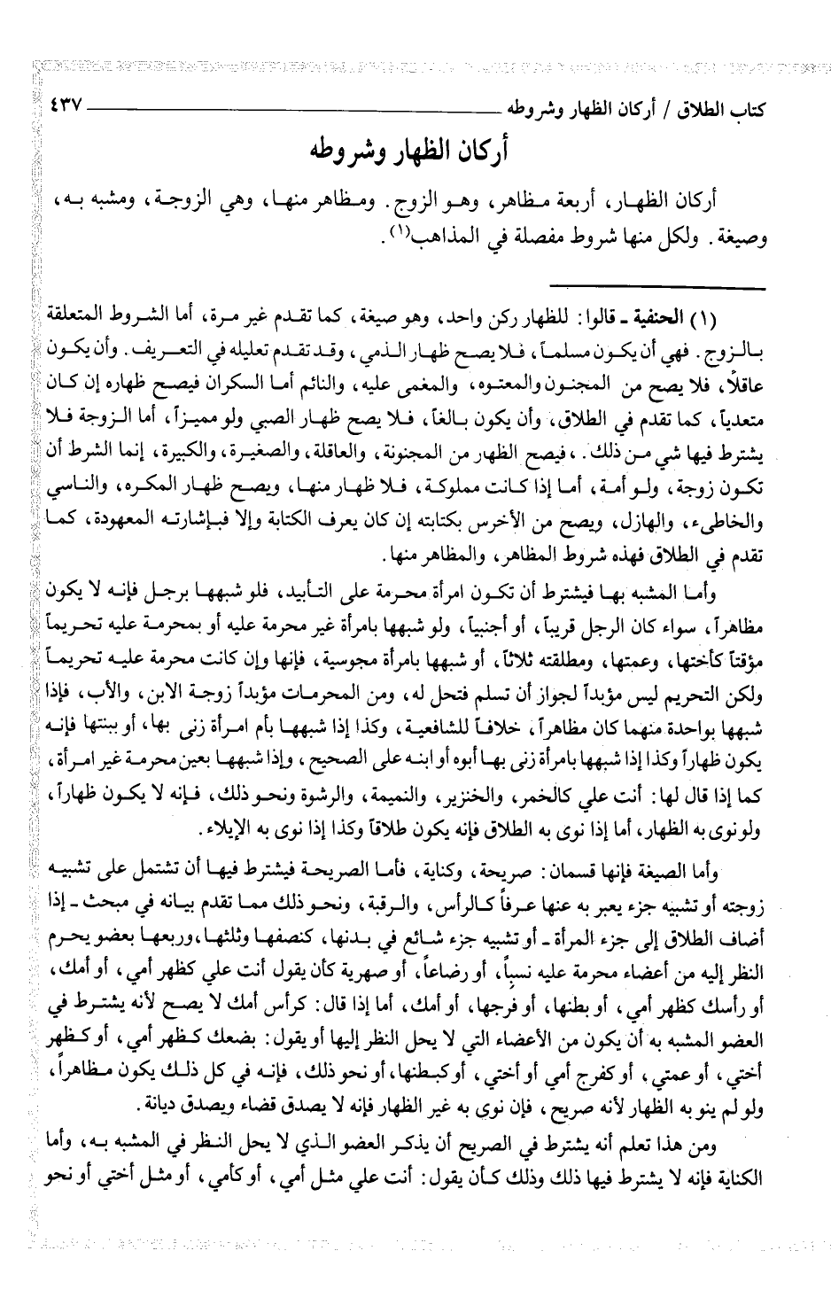 (¬1) (الحنفية - قالوا: للظهار ركن واحد، وهو صيغة، كما تقدم غير مرة، أما الشروط المتعلقة بالزوج. فهي أن يكون مسلماً، فلا يصح ظهار الذمي، وقد تقدم تعليله في التعريف. وأن يكون عاقلاً، فلا يصح من المجنون والمعتوه، والمغمى عليه، والنائم أما السكران فيصح ظهاره إن كان متعدياً، كما تقدم في الطلاق، وأن يكون بالغاً، فلا يصح ظهار الصبي ولو مميزاً، أما الزوجة فلا يشترط فيها شيء من ذلك. فيصح الظهار من المجنونة، والعاقلة، والصغيرة، والكبيرة، إنما الشرط أن تكون زوجة، ولو أمة، أما إذا كانت مملوكة، فلا ظهار منها، ويصح ظهار المكره، والناسي والخاطئ، والهازل، ويصح من الأخرس بكتابته إن كان يعرف الكتابة وإلا فبإشارته المعهودة، كما تقدم في الطلاق فهذه شروط المظاهر، والمظاهر منها.