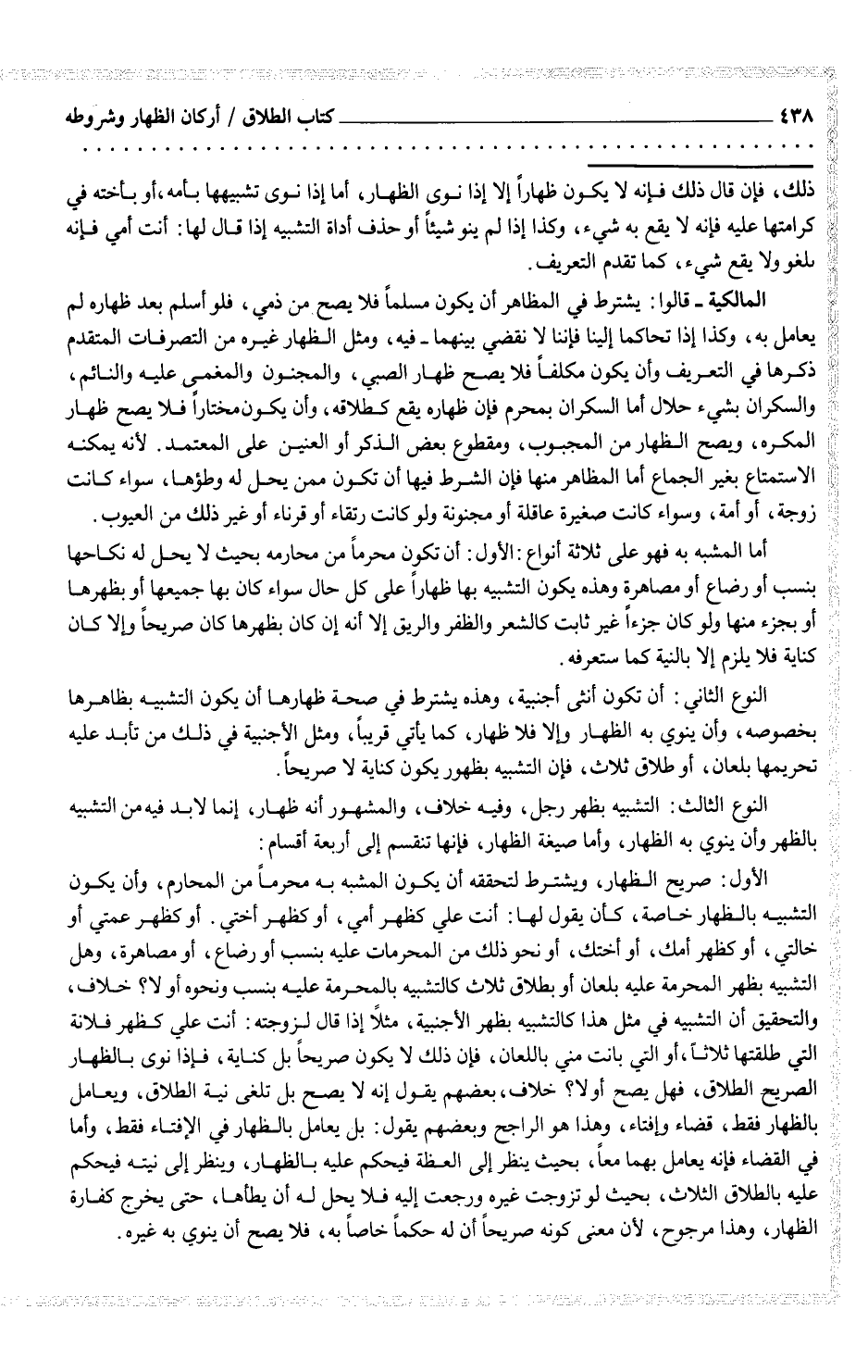 أما المشبه به فهو على ثلاثة أنواع: الأول: أن تكون محرماً من محارمه بحيث لا يحل له نكاحها بنسب أو رضاع أو مصاهرة وهذه يكون التشبيه بها ظهاراً على كل حال سواء كان بها جميعها أو بظهرها أو بجزء منها ولو كان جزءاً غير ثابت كالشعر والظفر والريق إلا أنه إن كان بظهرها كان صريحاً وإلا كان كناية فلا يلزم إلا بالنية كما ستعرفه.
