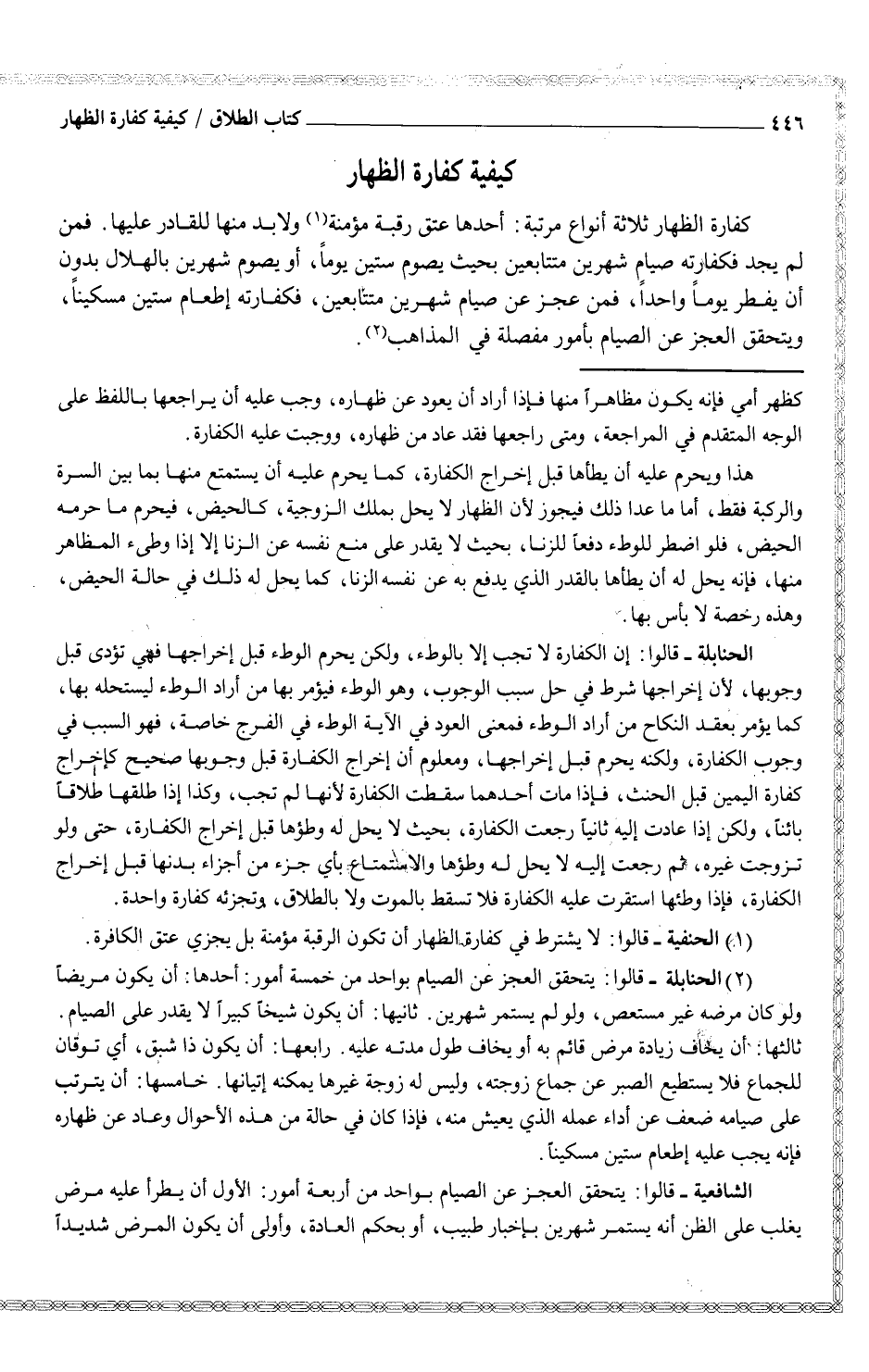 -كفارة الظهار ثلاثة أنواع مرتبة: أحدها عتق رقبة مؤمنة (¬1) ولا بد منها للقادر عليها. فمن لم يجد فكفارته صيام شهرين متتابعين بحيث يصوم ستين يوماً، أو يصوم شهرين بالهلال بدون أن يفطر يوماً واحداً، فمن عجز عن صيام شهرين متتابعين، فكفارته إطعام ستين مسكيناً، ويتحقق العجز عن الصيام بأمور مفصلة في المذاهب (¬2) .
