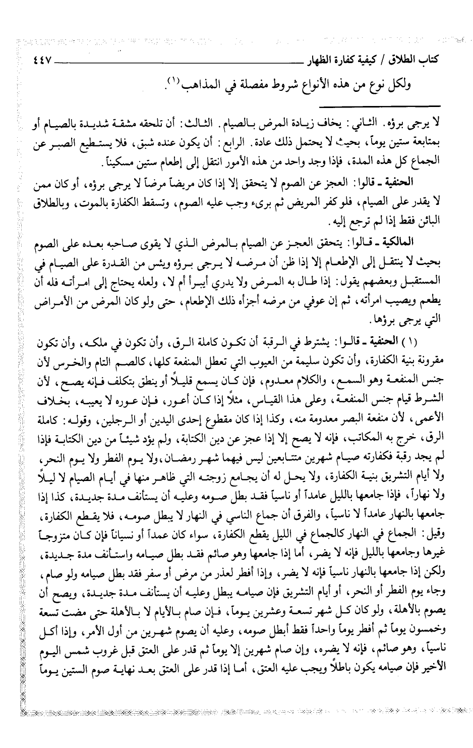 (¬1) (الحنفية - قالوا: يشترط في الرقبة أن تكون كاملة الرق، وأن تكون في ملكه، وأن تكون مقرونة بنية الكفارة، وأن تكون سليمة من العيوب التي تعطل المنفعة كلها، كالصم التام والخرس لأن جنس المنفعة وهو السمع، والكلام معدوم، فإن كان يسمع قليلاً أو ينطق بتكلف فإنه يصح، لأن الشرط قيام جنس المنفعة، وعلى هذا القياس، مثلاً إذا كان أعور، فإن عوره لا يعيبه، بخلاف الأعمى، لأن منفعة البصر معدومة منه، وكذا إذا كان مقطوع إحدى اليدين أو الرجلين، وقوله: كاملة الرق، خرج به المكاتب، فإنه لا يصح إلا إذا عجز عن دين الكتابة، ولم يؤد شيئاً من دين الكتابة فإذا لم يجد رقبة فكفارته صيام شهرين متتابعين ليس فيهما شهر رمضان، ولا يوم الفطر ولا يوم النحر، ولا أيام التشريق بنية الكفارة، ولا يحل له أن يجامع زوجته التي ظاهر منها في أيام الصيام لا ليلاً ولا نهاراً، فإذا جامعها بالليل عامداً أو ناسياً فقد بطل صومه وعليه أن يستأنف مدة جديدة، كذا إذا جامعها بالنهار عامداً لا ناسياً، والفرق أن جماع الناسي في النهار لا يبطل صومه، فلا يقطع الكفارة، وقيل: الجماع في النهار كالجماع في الليل يقطع الكفارة، سواء كان عمداً أو نسياناً فإن كان متزوجاً غيرها وجامعها بالليل فإنه لا يضر، أما إذا جامعها وهو صائم فقد بطل صيامه واستأنف مدة جديدة، ولكن إذا جامعها بالنهار ناسياً فإنه لا يضر، وإذا أفطر لعذر من مرض أو سفر فقد بطل صيامه ولو صام، وجاء يوم الفطر أو النحر، أو أيام التشريق فإن صيامه يبطل وعليه أن يستأنف مدة جديدة، ويصح أن يصوم بالأهلة، ولو كان كل شهر تسعة وعشرين يوماً، فإن صام بالأيام لا بالأهلة حتى مضت تسعة وخمسون يوماً ثم أفطر يوماً واحداً فقط أبطل صومه، وعليه أن يصوم شهرين من أول الأمر، وإذا أكل ناسياً، وهو صائم، فإنه لا