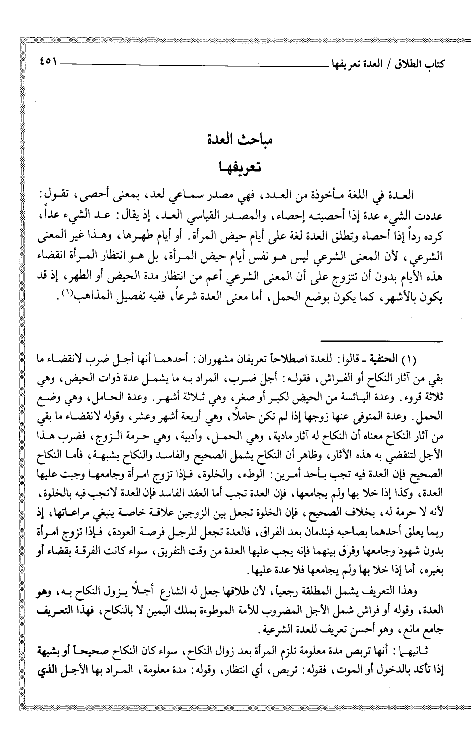(¬1) (الحنفية - قالوا: للعدة اصطلاحاً تعريفان مشهوران: أحدهما أنها أجل ضرب لانقضاء ما بقي من آثار النكاح أو الفراش، فقوله: أجل ضرب، المراد به ما يشمل عدة ذوات الحيض، وهي ثلاثة قروء. وعدة اليائسة من الحيض لكبر أو صغر، وهي ثلاثة أشهر. وعدة الحامل، وهي وضع الحمل. وعدة المتوفى عنها زوجها إذا لم تكن حاملاً، وهي أربعة أشهر وعشر، وقوله لانقضاء ما بقي من آثار النكاح معناه أن النكاح له آثار مادية، وهي الحمل، وأدبية، وهي حرمة الزوج، فضرب هذا الأجل لتنقضي به هذه الآثار، وظاهر أن النكاح يشمل الصحيح والفاسد والنكاح بشبهة، فأما النكاح الصحيح فإن العدة فيه تجب بأحد أمرين: الوطء، والخلوة، فإذا تزوج امرأة وجامعها وجبت عليها العدة، وكذا إذا خلا بها ولم يجامعها، فإن العدة تجب أما العقد الفاسد فإن العدة لا تجب فيه بالخلوة، لأنه لا حرمة له، بخلاف الصحيح، فإن الخلوة تجعل بين الزوجين علاقة خاصة ينبغي مراعاتها، إذ ربما يعلق أحدهما بصاحبه فيندمان بعد الفراق، فالعدة تجعل للرجل فرصة العودة، فإذا تزوج امرأة بدون شهود وجامعها وفرق بينهما فإنه يجب عليها العدة من وقت التفريق، سواء كانت الفرقة بقضاء أو بغيره، أما إذا خلا بها ولم يجامعها فلا عدة عليها.