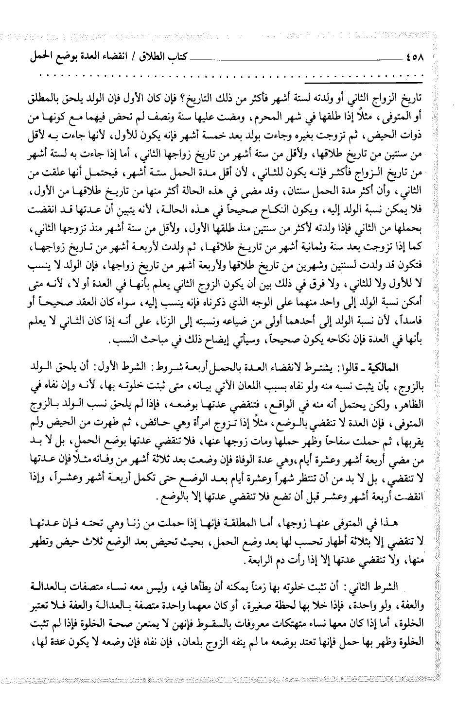 المالكية - قالوا: يشترط لانقضاء العدة بالحمل أربعة شروط: الشرط الأول: أن يلحق الولد بالزوج، بأن يثبت نسبه منه ولو نفاه بسبب اللعان الآتي بيانه، متى ثبتت خلوته بها، لأنه وإن نفاه في الظاهر، ولكن يحتمل أنه منه في الواقع، فتنقضي عدتها بوضعه، فإذا لم يلحق نسب الولد بالزوج المتوفى، فإن العدة لا تنقضي بالوضع، مثلاً إذا تزوج امرأة وهي حائض، ثم طهرت من الحيض ولم يقربها، ثم حملت سفاحاً وظهر حملها ومات زوجها عنها، فلا تنقضي عدتها بوضع الحمل، بل لا بد من مضي أربعة أشهر وعشرة أيام، وهي عدة الوفاة فإن وضعت بعد ثلاثة أشهر من وفاته مثلاً فإن عدتها لا تنقضي، بل لا بد من أن تنتظر شهراً وعشرة أيام بعد الوضع حتى تكمل أربعة أشهر وعشراً، وإذا انقضت أربعة أشهر وعشر قبل أن تضع فلا تنقضي عدتها إلا بالوضع.