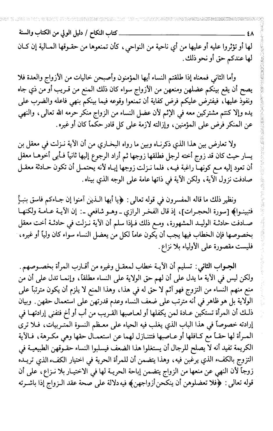 الجواب الثاني: تسليم أن الآية خطاب لمعقل وغيره من أقارب المرأة بخصوصهم. ولكن ليس في الآية ما يدل على أن لهم حق الولاية على النساء مطلقاً، وإنما تدل على أن من منع منه النساء من التزوج فهو آثم لا حق له في هذا، وهذا المنع لا يلزم أن يكون مترتباً على الولاية بل هو ظاهر في أنه مترتب على ضعف النساء وعدم قدرتهن على استعمال حقهن. وبيان ذلك أن المرأة تستكين عادة لمن يكفلها أو لعاصبها القريب من أب أو أخ فتفنى إرادتها في إرادته خصوصاً في هذا الباب الذي يغلب فيه الحياء على معظم النسوة المتربيات، فلا ترى المرأة لها حقاً مع كافلها أو عاصبها فتتنازل لهما عن استعمال حقها وهي مكرهة، فالآية الكريمة تفيد أنه لا يصلح للرجال أن يستغلوا هذا الضعف فيسلبوا النساء حقوقهن الطبيعية في التزوج بالكفء الذي يرغبن فيه، وهذا يتضمن أن للمرأة الحرية في اختيار الكفء الذي تريده زوجاً لأن النهي عن منعها من الزواج يتضمن إباحة الحرية لها في الاختيار بلا نزاع، على أن قوله تعالى: {فلا تعضلوهن أن ينكحن أزواجهن} فيه دلالة على صحة عقد الزواج إذا باشرته