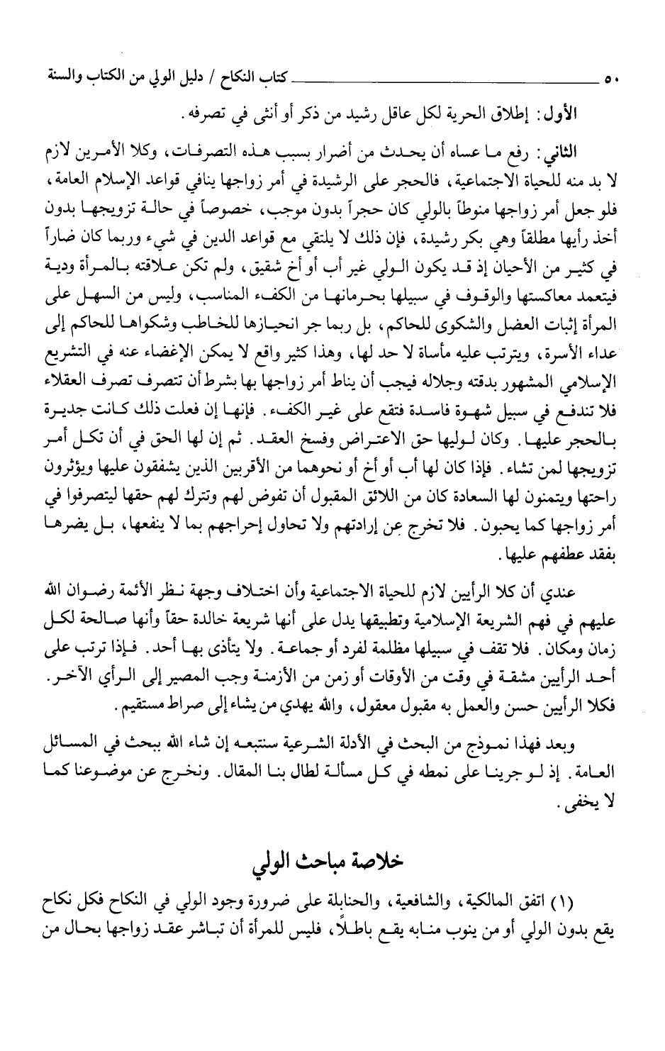 - (1) اتفق المالكية، والشافعية، والحنابلة على ضرورة وجود الولي في النكاح فكل نكاح يقع بدون ولي أو من ينوب منابه يقع باطلاً، فليس للمرأة أن تباشر عقد زواجها بحال من