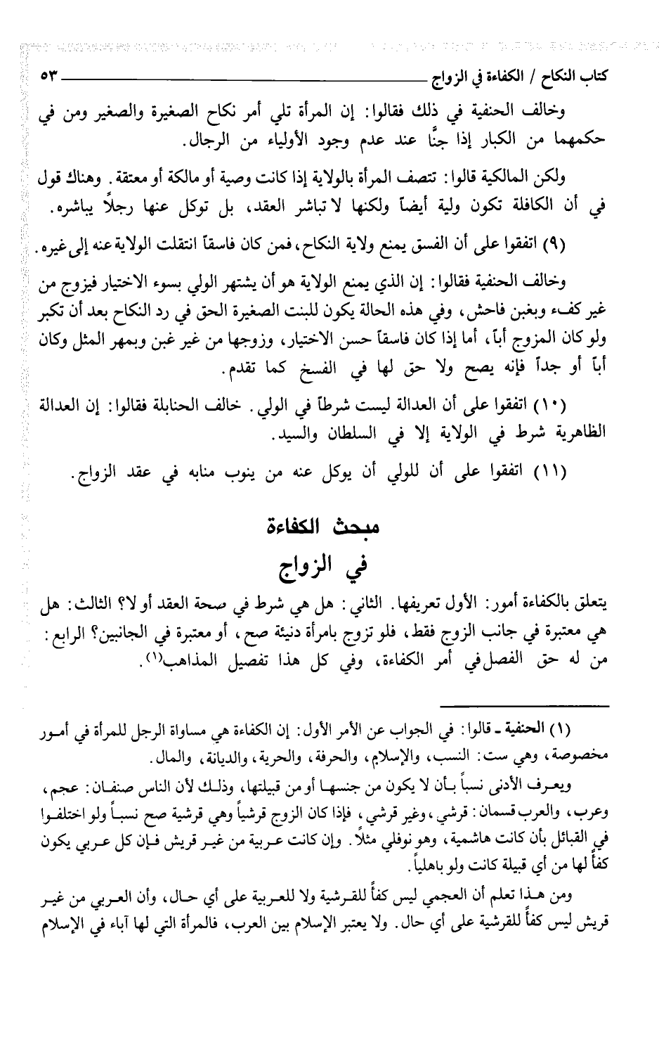 -يتعلق بالكفاءة أمور: الأول تعريفها. الثاني: هل هي شرط في صحة العقد أو لا؟ الثالث: هل هي معتبرة في جانب الزوج فقط، فلو تزوج بامرأة دنيئة صح، أو معتبرة في الجانبين؟ الرابع: من له حق الفصل في أمر الكفاءة، وفي كل هذا تفصيل المذاهب (¬1)