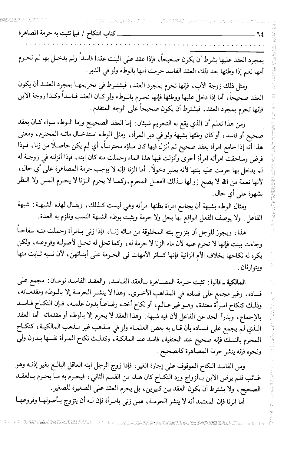 المالكية - قالوا: تثبت حرمة المصاهرة بالعقد الفاسد، والعقد الفاسد نوعان: مجمع على فساده، وغير مجمع على فساده في المذاهب الأخرى، وهذا لا ينشر الحرمة إلا بالوطء ومقدماته، وذلك كنكاح امرأة معتدة، وهو غير عالم، أو نكاح أخته رضاعاً بدون علمه، فإن النكاح فاسد بالإجماع، ويدرأ الحد عن الفاعل لأن فيه شبهة. وهذا العقد لا يحرم إلا بالوطء أو مقدماته أما العقد الذي لم يجمع على فساده بأن قال به بعض العلماء ولو في مذهب غير مذهب المالكية، كنكاح المحرم بالنسك فإنه صحيح عند الحنفية، فاسد عند المالكية، وكذلك نكاح المرأة نفسها بدون ولي ونحوه فإنه ينشر حرمة المصاهرة كالصحيح.