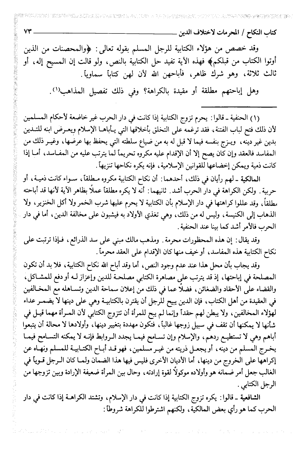 (¬1) (الحنفية - قالوا: يحرم تزوج الكتابية إذا كانت في دار الحرب غير خاضعة لأحكام المسلمين لأن ذلك فتح لباب الفتنة، فقد ترغمه على التخلق بأخلاقها التي يأباها الإسلام ويعرض ابنه للتدين بدين غير دينه، ويزج نفسه فيما لا قبل له به من ضياع سلطته التي يحفظ بها عرضها، وغير ذلك من المفاسد فالعقد وإن كان يصح إلا أن الإقدام عليه مكروه تحريماً لما يترتب عليه من المفاسد، إما إذا كانت ذمية ويمكن إخضاعها للقوانين الإسلامية، فإنه يكره نكاحها تنزيهاً.