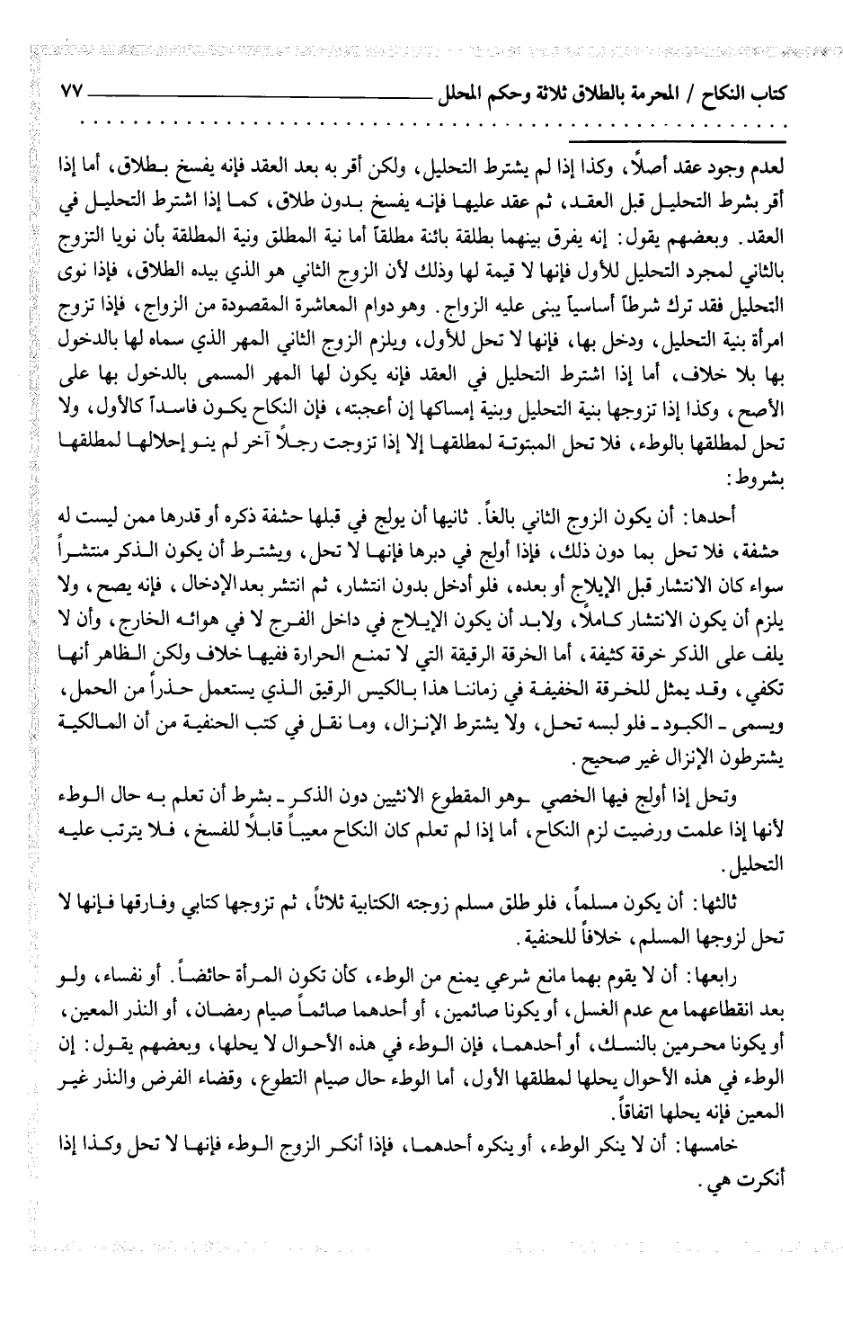 أحدها: أن يكون الزوج الثاني بالغاً. ثانيها أن يولج في قبلها حشفة ذكره أو قدرها ممن ليست له حشفة، فلا تحل بما دون ذلك، فإذا أولج في دبرها فإنها لا تحل، ويشترط أن يكون الذكر منتشراً سواء كان الانتشار قبل الإيلاج أو بعده، فلو أدخل بدون انتشار، ثم انتشر بعد الإدخال، فإنه يصح، ولا يلزم أن يكون الانتشار كاملاً، ولا بد أن يكون الإيلاج في داخل الفرج لا في هوائه الخارج، وأن لا يلف على الذكر خرقة كثيفة، أما الخرقة الرقيقة التي لا تمنع الحرارة ففيها خلاف ولكن الظاهر أنها تكفي، وقد يمثل للخرقة الخفيفة في زماننا هذا بالكيس الرقيق الذي يستعمل حذراً من الحمل، ويسمى - الكبود - فلو لبسه تحل، ولا يشترط الإنزال، وما نقل في كتب الحنفية من أن المالكية يشترطون الإنزال غير صحيح.