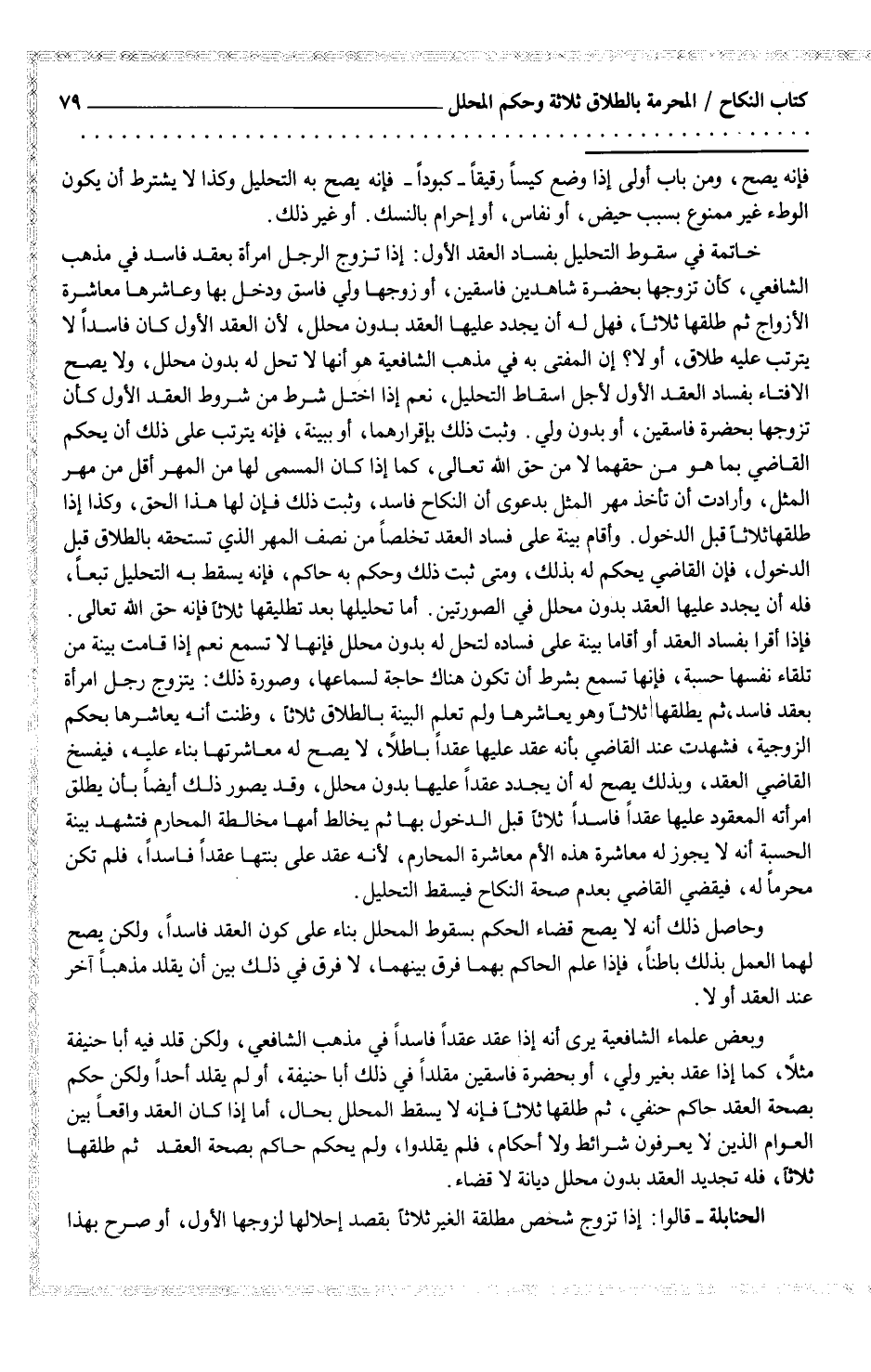 خاتمة في سقوط التحليل بفساد العقد الأول: إذا تزوج الرجل امرأة بعقد فاسد في مذهب الشافعي، كأن تزوجها بحضرة شاهدين فاسقين، أو زوجها ولي فاسق ودخل بها وعاشرها معاشرة الأزواج ثم طلقها ثلاثاً، فهل له أن يجد عليها العقد بدون محلل، لأن العقد الأول كان فاسداً لا يترتب عليه طلاق، أولا؟ إن المفتى به في مذهب الشافعية هو أنها لا تحل له بدون محلل، ولا يصح الإفتاء بفساد العقد الأول لأجل إسقاط التحليل، نعم إذا اختل شرط من شروط العقد الأول كأن تزوجها بحضرة فاسقين، أو بدون ولي. وثبت ذلك بإقرارهما، أو ببينة، فإنه يترتب على ذلك أن يحكم القاضي بما هو من حقهما لا من حق الله تعالى، كما إذا كان المسمى لها من المهر أقل من مهر المثل، وأرادت أن تأخذ مهر المثل بدعوى أن النكاح فاسد، وثبت ذلك فإن لها هذا الحق، وكذا إذا طلقها ثلاثاً قبل الدخول. وأقام بينة على فساد العقد تخلصاً من نصف المهر الذي تستحقه بالطلاق قبل الدخول، فإن القاضي يحكم له بذلك، ومتى ثبت ذلك وحكم به حاكم، فإنه يسقط به التحليل تبعاً، فله أن يجدد عليها العقد بدون محلل في الصورتين. أما تحليلها بعد تطليقها ثلاثاً فإنه حق الله تعالى.