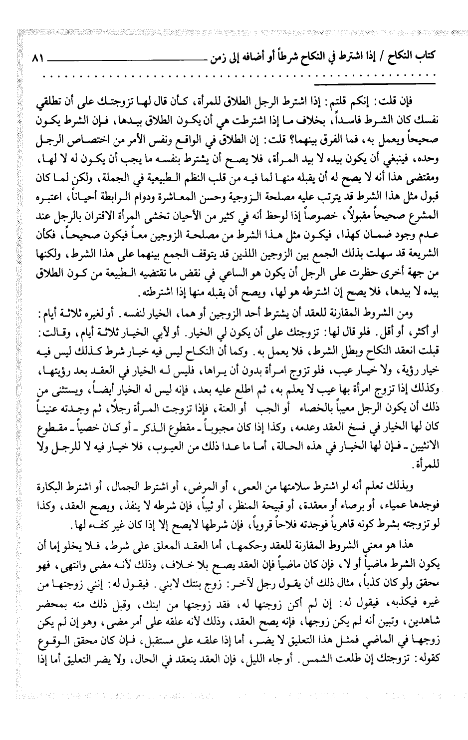 فإن قلت: إنكم قلتم: إذا اشترط الرجل الطلاق للمرأة، كأن قال لها تزوجتك على أن تطلقي نفسك كان الشرط فاسداً، بخلاف ما إذا اشترطت هي أن يكون الطلاق بيدها، فإن الشرط يكون صحيحاً ويعمل به، فما الفرق بينهما؟ قلت: إن الطلاق في الواقع ونفس الأمر من اختصاص الرجل وحده، فينبغي أن يكون بيده لا بيد المرأة، فلا يصح أن يشترط بنفسه ما يجب أن يكون له لا لها، ومقتضى هذا أنه لا يصح له أن يقبله منها لما فيه من قلب النظم الطبيعية في الجملة، ولكن لما كان قبول مثل هذا الشرط قد يترتب عليه مصلحة الزوجية وحسن المعاشرة ودوام الرابطة أحياناً، اعتبره المشرع صحيحاً مقبولاً، خصوصاً إذا لوحظ أنه في كثير من الأحيان تخشى المرأة الاقتران بالرجل عند عدم وجود ضمان كهذا، فيكون مثل هذا الشرط من مصلحة الزوجين معاً فيكون صحيحاً، فكأن الشريعة قد سهلت بذلك الجمع بين الزوجين اللذين قد يتوقف الجمع بينهما على هذا الشرط، ولكنها من جهة أخرى حظرت على الرجل أن يكون هو الساعي في نقض ما تقتضيه الطبيعة من كون الطلاق بيده لا بيدها، فلا يصح إن اشترطه هو لها، ويصح أن يقبله منها إذا اشترطته.