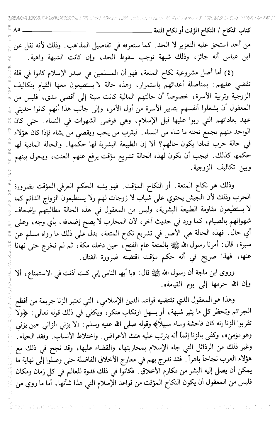 وهذا هو المعقول الذي تقتضيه قواعد الدين الإسلامي، التي تعتبر الزنا جريمة من أفظع الجرائم وتحظر كل ما يثير شبهة، أو يسهل ارتكاب منكر، ويكفي في ذلك قوله تعالى: {ولا تقربوا الزنا إنه كان فاحشة وساء سبيلاً} وقوله صلى الله عليه وسلم: "لا يزني الزاني حين يزني وهو مؤمن"، وكفى بالزنا إثماً أنه يترتب عليه هتك الأعراض. واختلاط الأنساب. وفقد الحياء. وغير ذلك من الرذائل التي جاء الإسلام بمحاربتها، والقضاء عليها، وقد نجح في ذلك مع هؤلاء العرب نجاحاً باهراً. فقد يدرج بهم في معارج الأخلاق الفاضلة حتى وصلوا إلى نهاية ما يمكن أن يصل إليه البشر من مكارم الأخلاق. فكانوا في ذلك قدوة للعالم في كل زمان ومكان فليس من المعقول أن يكون النكاح المؤقت من قواعد الإسلام التي هذا شأنها، أما ما روي من