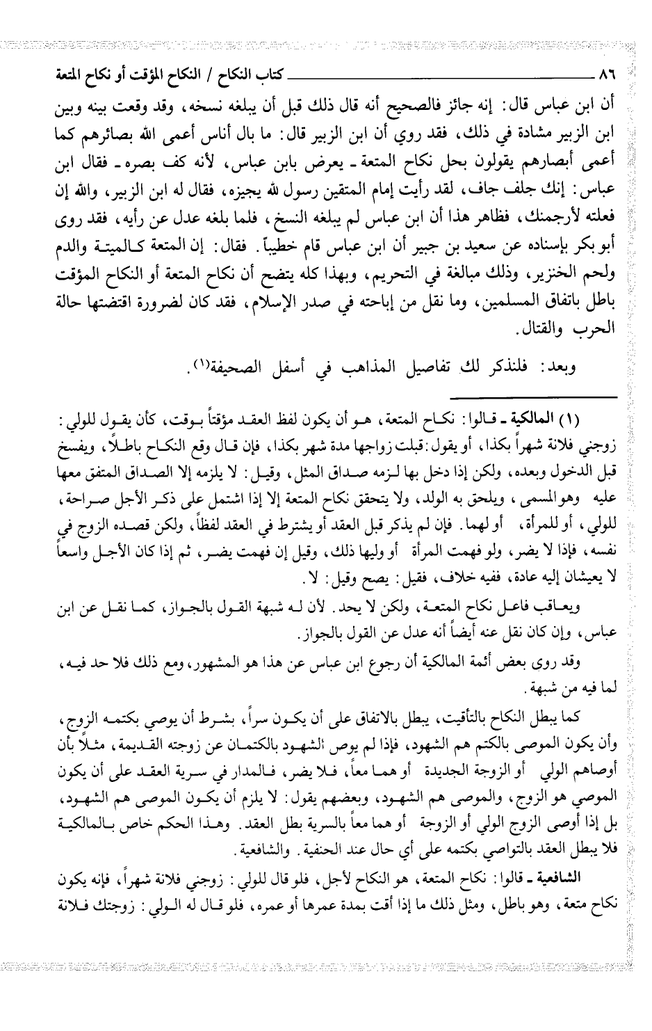 أن ابن عباس قال: أنه جائز فالصحيح أنه قال ذلك قبل أن يبلغه نسخه، وقد وقعت بينه وبين ابن الزبير مشادة في ذلك، فقد روي أن ابن الزبير قال: ما بال أناس أعمى الله بصائرهم كما أعمى أبصارهم يقولون بحل نكاح المتعة يعرض بابن عباس، لأنه كف بصره فقال ابن عباس: إنك جلف جاف، لقد رأيت إمام المتقين رسول الله يجيزه، فقال له ابن الزبير، والله إن فعلته لأرجمنك، فظاهر هذا أن عباس لم يبلغه النسخ، فلما بلغه عدل عن رأيه، فقد روى أبو بكر بإسناده عن سعيد بن جبير أن ابن عباس قام خطيباً. فقال: إن المتعة كالميتة والدم ولحم الخنزير، وذلك مبالغة في التحريم، وبهذا كله يتضح أن نكاح المتعة أو النكاح المؤقت باطل باتفاق المسلمين، وما نقل من إباحته في صدر الإسلام، فقد كان لضرورة اقتضتها حالة الحرب والقتال.