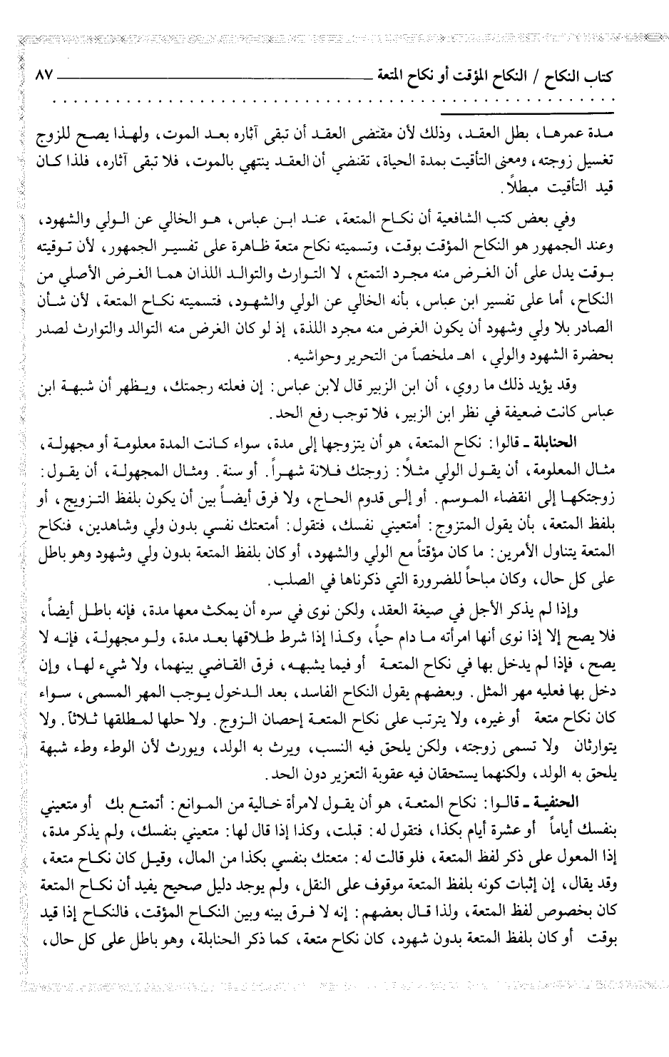 وفي بعض كتب الشافعية أن نكاح المتعة، عند ابن عباس، هو الخالي عن الولي والمشهود، وعند الجمهور هو النكاح المؤقت بوقت، وتسميته نكاح متعة ظاهرة على تفسير الجمهور، لأن توقيته بوقت يدل على أن الغرض منه مجرد التمتع، لا التوارث والتوالد اللذان هما الغرض الأصلي من النكاح، أما على تفسير ابن عباس، بأنه الخالي عن الولي والشهود، فتسميته نكاح المتعة، لأن شأن الصادر بلا ولي وشهود أن يكون الغرض منه مجرد اللذة، إذ لو كان الغرض منه التوالد والتوارث لصدر بحضرة الشهود والولي، اه ملخصاً من التحرير وحواشيه.