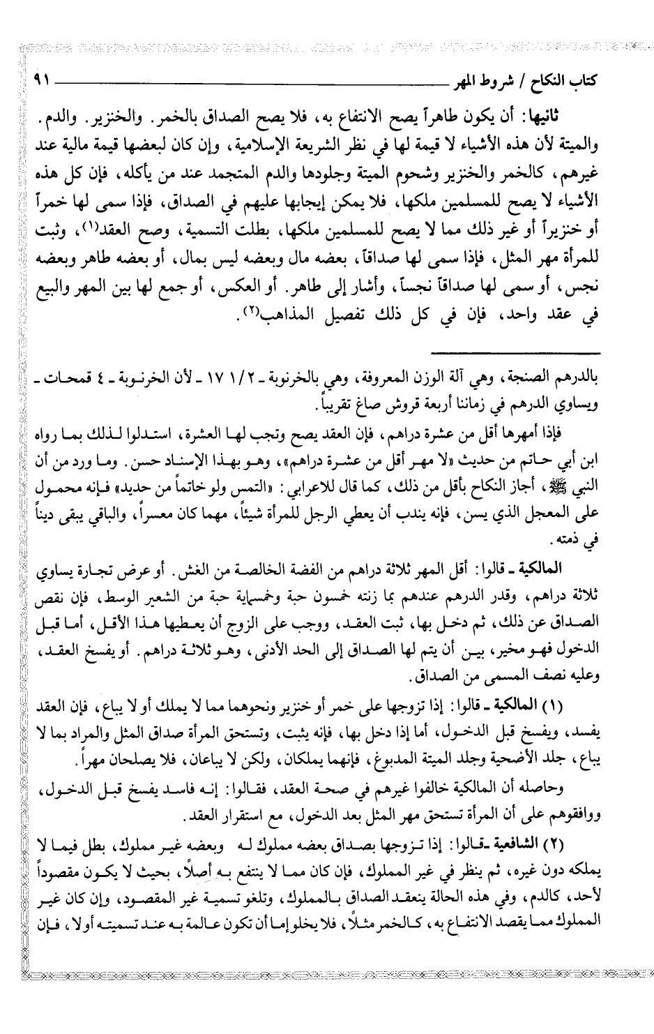ثانيها: أن يكون طاهراً يصح الانتفاع به، فلا يصح الصداق بالخمر. والخنزير، والدم. والميتة لأن هذه الأشياء لا قيمة لها في نظر الشريعة الإسلامية، وإن كان لبعضها قيمة مالية عند غيرهم، كالخمر والخنزير وشحوم الميتة وجلودها والدم المتجمد عند من يأكله، فإن كل هذه الأشياء لا يصح للمسلمين ملكها، فلا يمكن إيجابها عليهم في الصداق، فإذا سمى لها خمراً أو خنزيراً أو غير ذلك مما لا يصح للمسلمين ملكها، بطلت التسمية، وصح العقد (¬1) ، وثبت للمرأة مهر المثل، فإذا سمى لها صداقاً، بعضه مال وبعضه ليس بمال، أو بعضه طاهر وبعضه نجس، أو سمى لها صداقاً نجساً، وأشار إلى طاهر. أو العكس، أو أجمع لها بين المهر والبيع في عقد واحد، فإن في كل ذلك تفصيل المذاهب (¬2) .
