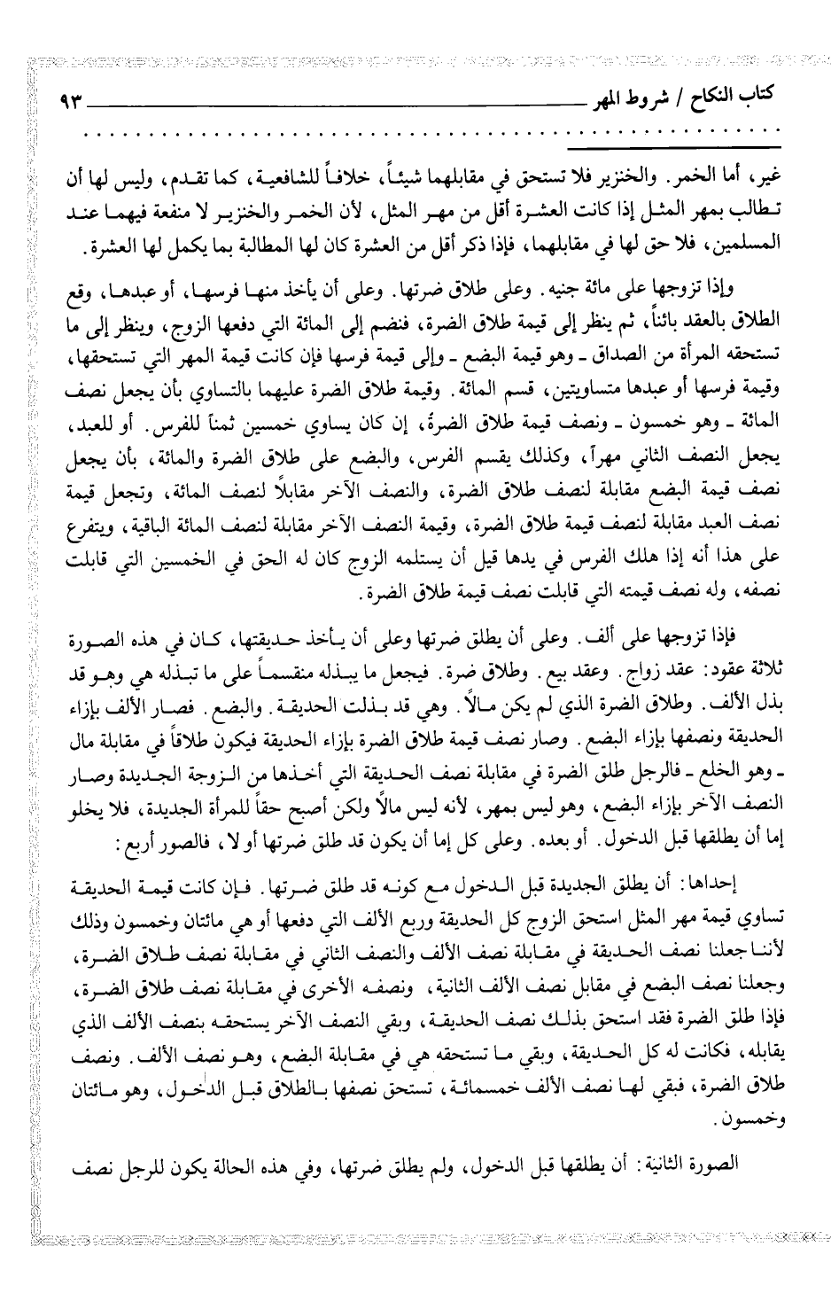 غير، أما الخمر. والخنزير فلا تستحق في مقابلهما شيئاً، خلافاً للشافعية، كما تقدم، وليس لها أن تطالب بمهر المثل إذا كانت العشرة أقل من مهر المثل، لن الخمر والخنزير لا منفعة فيهما عند المسلمين، فلا حق لها في مقابلهما، فإذا ذكر أقل من العشرة كان لها المطالبة بما يكمل لها العشرة. وإذا تزوجها على مائة جنيه. وعلى طلاق ضرتها. وعلى أن يأخذ منها فرسها، أو عبدها، وقع الطلاق بالعقد بائناً، ثم ينظر إلى قيمة طلاق الضرة، وقيمة النصف الآخر مقابلة لنصف المائة الباقية، ويتفرع على أن هذا أنه إذا هلك الفرس في يدها قيل أن يستلمه الزوج كان له الحق في الخمسين التي قابلت نصفه، وله نصف قيمته التي قابلت نصف قيمة طلاق الضرة.