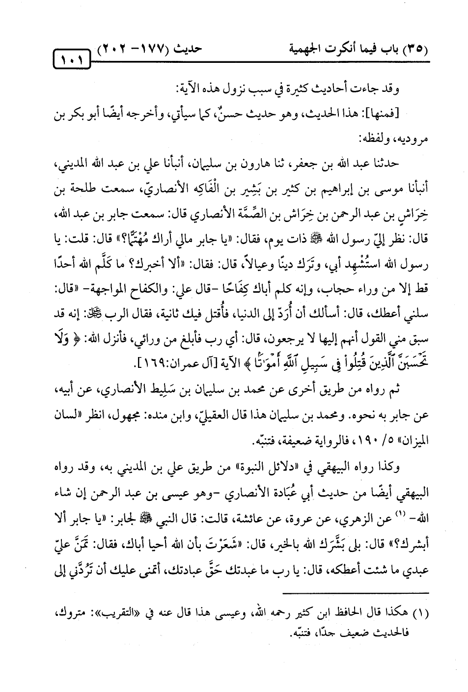 حَدَّثَنَا عبد الله بن جعفر، ثنا هارون بن سليمان، أنبأنا علي بن عبد الله المديني، أنبأنا موسى بن إبراهيم بن كثير بن بَشِير بن الْفَاكِه الأنصاريّ، سمعت طلحة بن خِرَاشٍ بن عبد الرّحمن بن خِرَاش بن الصِّمَة الأنصاري قال: سمعت جابر بن عبد الله، قال: نظر إليّ رسول الله -صلى الله عليه وسلم- ذات يوم، فقال: "يا جابر ما لي أراك مُهْتما؟ " قال: قلت: يا رسول الله استُشْهِد أبي، وتَرَك دينًا وعيالًا، قال: فقال: "ألَّا أخبرك؟ ما كَلَّم الله أحدًا قط إِلَّا من وراء حجاب، وإنه كلَّم أباك كِفَاحًا -قال علي: والكفاح المواجهة- "قال: سلني أعطك، قال: أسأَلُكَ أن أُرَدّ إلى الدنيا، فأُقتل فيك ثانية، فقال الرب -عَزَّ وَجَلَّ-: إنّه قد سبق مني القول أنهم إليها لا يرجعون، قال: أي رب فأبلغ من ورائي، فأنزل الله: {وَلَا تَحْسَبَنَّ الَّذِينَ قُتِلُوا في سَبِيلِ اللَّهِ أَمْوَاتًا} الآية [آل عمران: 169].