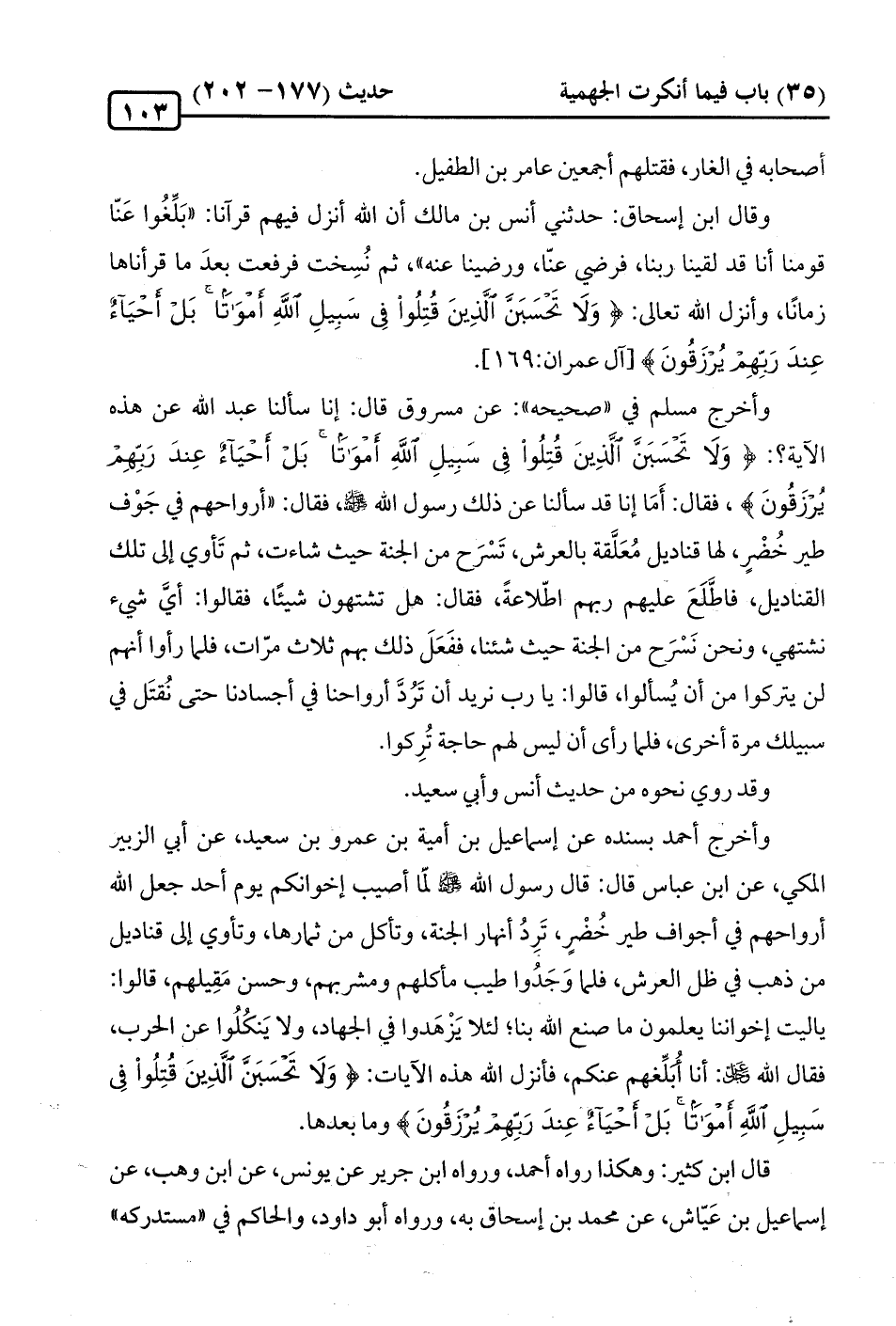 وأخرج أحمد بسنده عن إسماعيل بن أمية بن عمرو بن سعيد، عن أبي الزُّبير المكي، عن ابن عبّاس قال: قال رسول الله - صلّى الله عليه وسلم - لمّا أصيب إخوانكم يوم أحد جعل الله أرواحهم في أجواف طير خُضْرٍ، تَرِدُ أنهار الجنَّة، وتأكل من ثمارها، وتأوي إلى قناديل من ذهب في ظل العرش، فلما وَجَدُوا طيب مأكلهم ومشربهم، وحسن مَقِيلهم، قالوا: يا ليت إخواننا يعلمون ما صنع الله بنا؛ لئلا يَزْهَدوا في الجهاد، ولا يَنكُلُوا عن الحرب، فقال الله -عَزَّ وَجَلَّ-: أنا أُبَلِّغهم عنكم، فأنزل الله هذه الآيات: {وَلَا تَحْسَبَنَّ الَّذِينَ قُتِلُوا في سَبِيلِ اللَّهِ أَمْوَاتًا بَلْ أَحْيَاءٌ عِنْدَ رَبِّهِمْ يُرْزَقُونَ} وما بعدها.